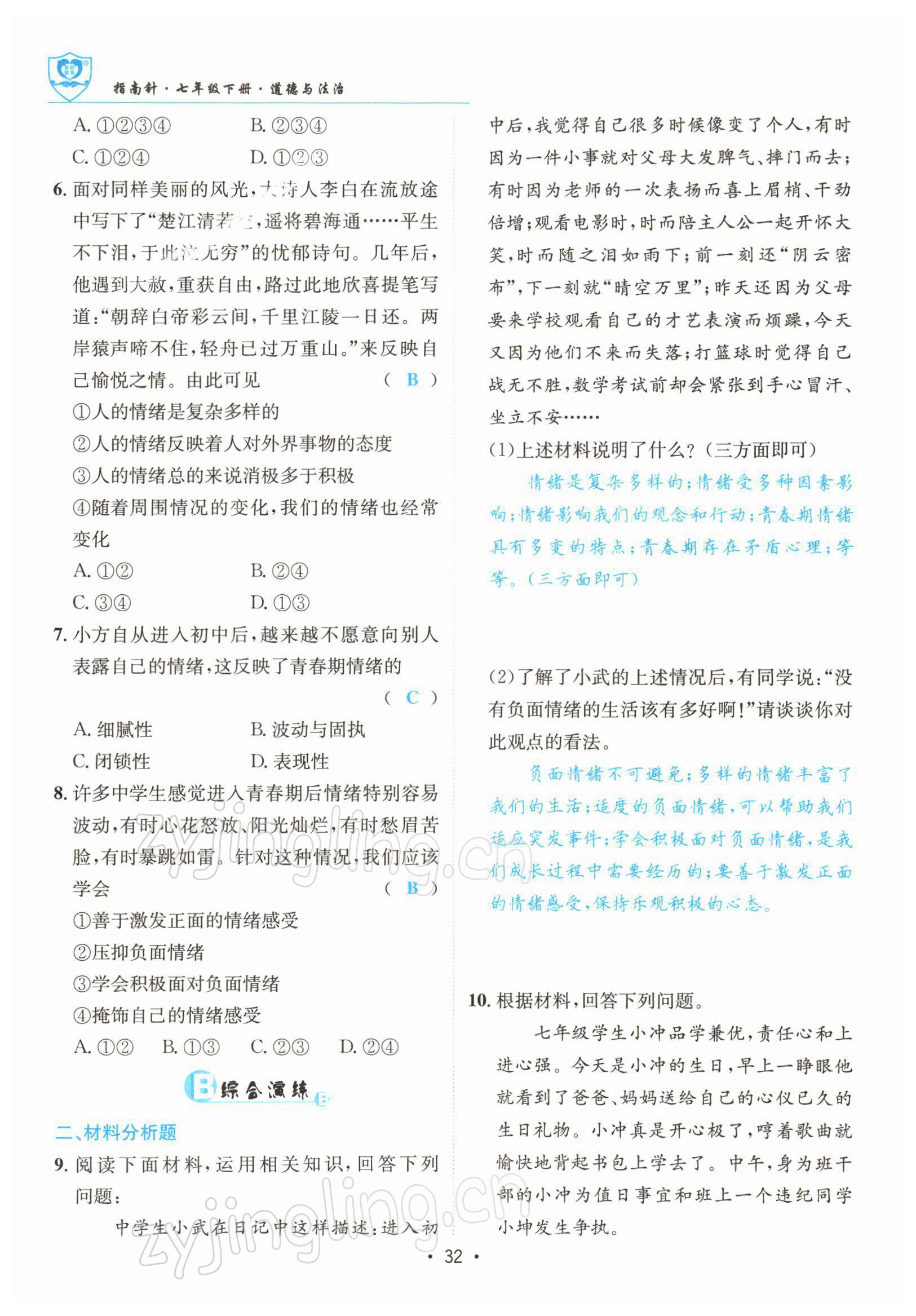 注:目前有些书本章节名称可能整理的还不是很完善,但都是按照顺序排列的,请同学们按照顺序仔细查找。练习册 2022年指南针导学探究七年级道德与法治下册人教版 答案主要是用来给同学们做完题方便对答案用的,请勿直接抄袭。