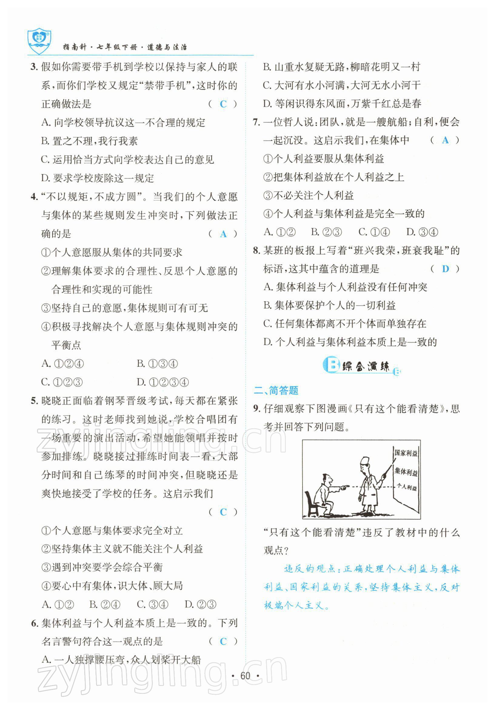 注:目前有些书本章节名称可能整理的还不是很完善,但都是按照顺序排列的,请同学们按照顺序仔细查找。练习册 2022年指南针导学探究七年级道德与法治下册人教版 答案主要是用来给同学们做完题方便对答案用的,请勿直接抄袭。