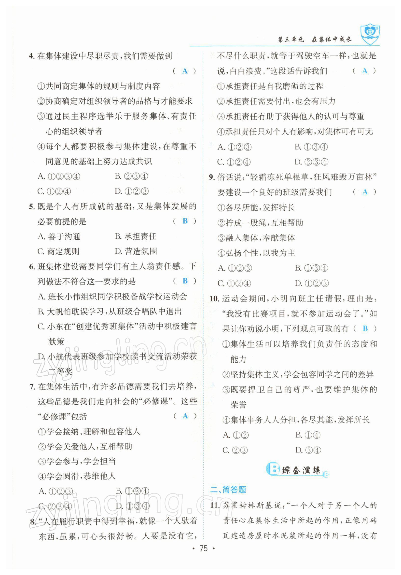注:目前有些书本章节名称可能整理的还不是很完善,但都是按照顺序排列的,请同学们按照顺序仔细查找。练习册 2022年指南针导学探究七年级道德与法治下册人教版 答案主要是用来给同学们做完题方便对答案用的,请勿直接抄袭。