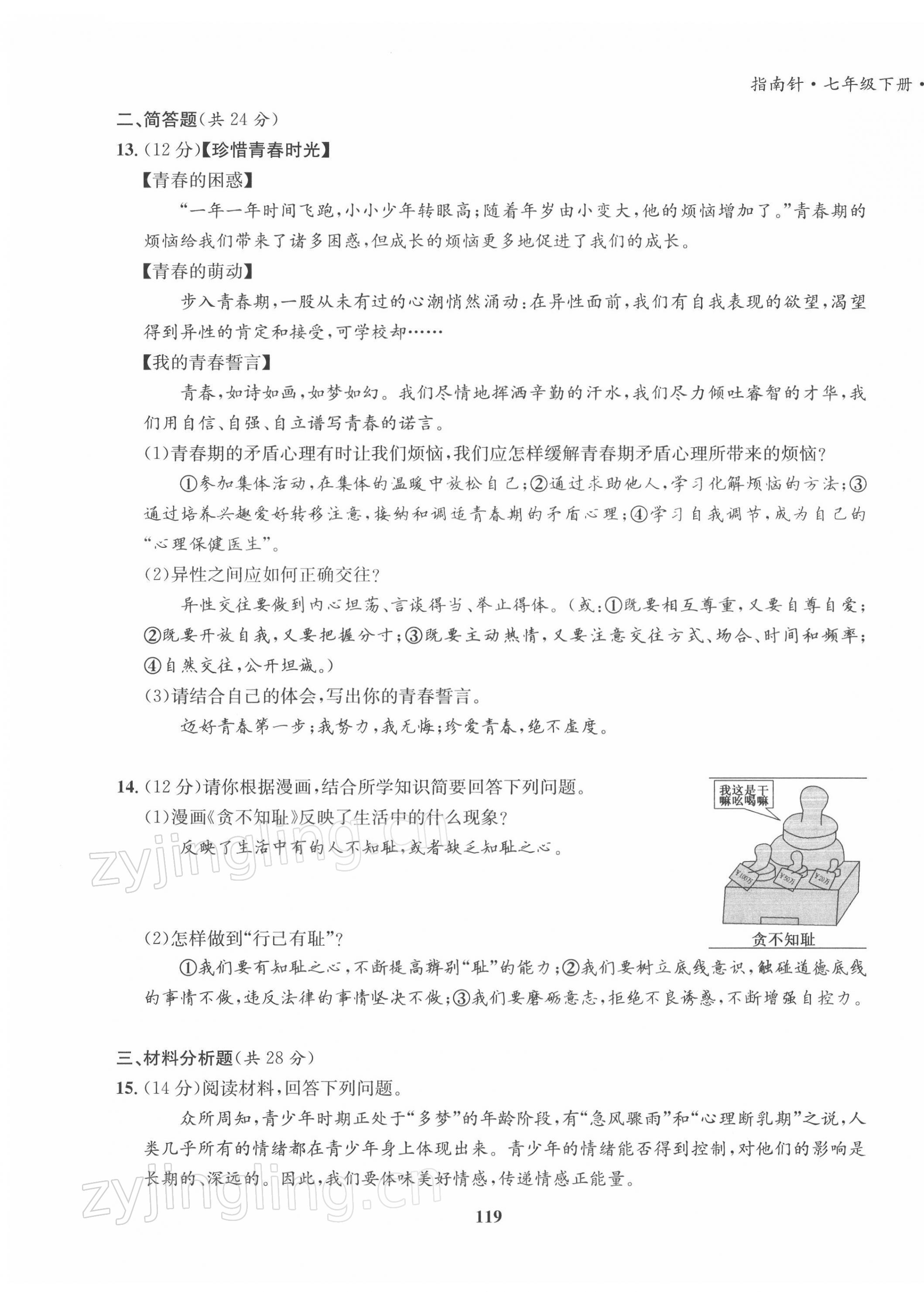 注:目前有些书本章节名称可能整理的还不是很完善,但都是按照顺序排列的,请同学们按照顺序仔细查找。练习册 2022年指南针导学探究七年级道德与法治下册人教版 答案主要是用来给同学们做完题方便对答案用的,请勿直接抄袭。