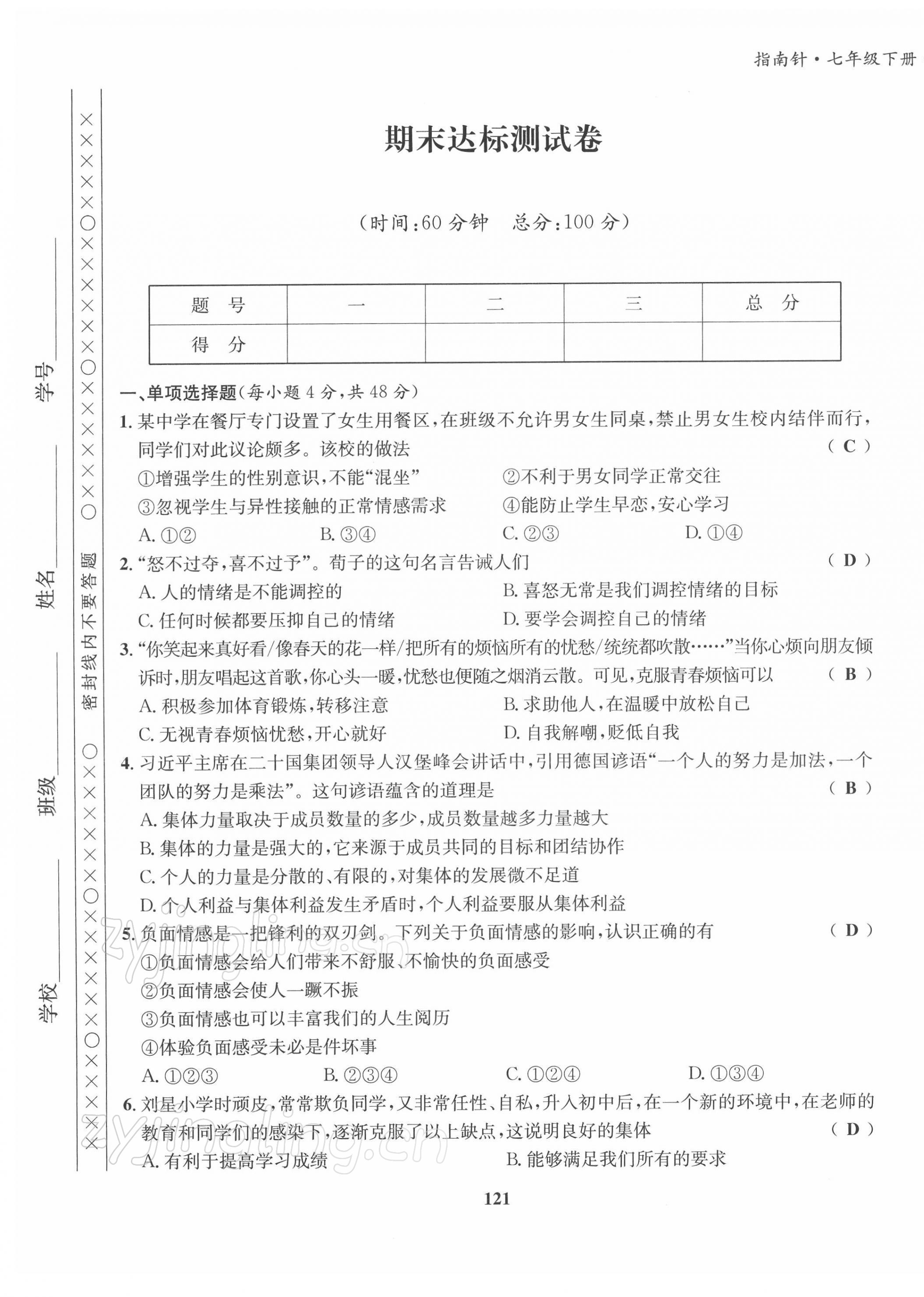 注:目前有些书本章节名称可能整理的还不是很完善,但都是按照顺序排列的,请同学们按照顺序仔细查找。练习册 2022年指南针导学探究七年级道德与法治下册人教版 答案主要是用来给同学们做完题方便对答案用的,请勿直接抄袭。