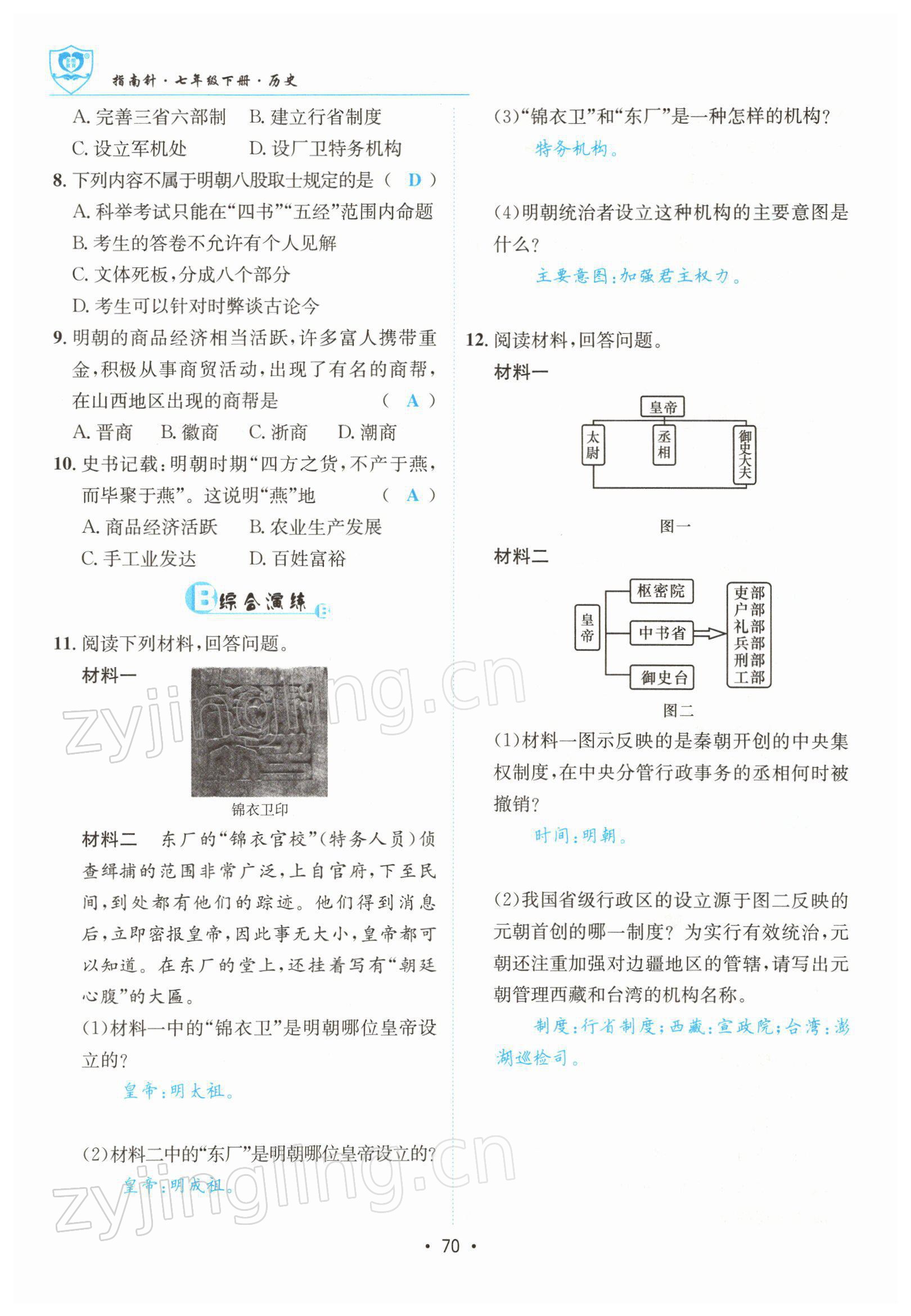注:目前有些书本章节名称可能整理的还不是很完善,但都是按照顺序排列的,请同学们按照顺序仔细查找。练习册 2022年指南针导学探究七年级历史下册人教版 答案主要是用来给同学们做完题方便对答案用的,请勿直接抄袭。