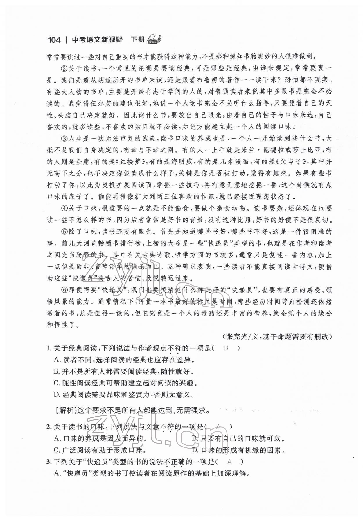 注:目前有些书本章节名称可能整理的还不是很完善,但都是按照顺序排列的,请同学们按照顺序仔细查找。练习册 2022年中考新视野九年级语文下册中考用书人教版 答案主要是用来给同学们做完题方便对答案用的,请勿直接抄袭。