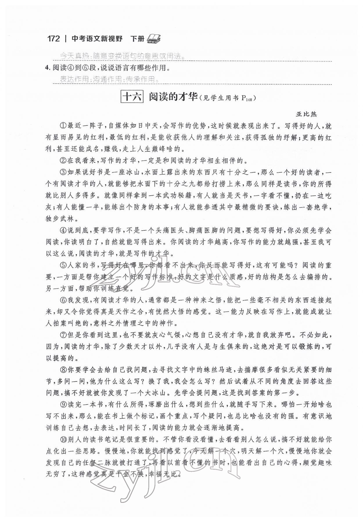 注:目前有些书本章节名称可能整理的还不是很完善,但都是按照顺序排列的,请同学们按照顺序仔细查找。练习册 2022年中考新视野九年级语文下册中考用书人教版 答案主要是用来给同学们做完题方便对答案用的,请勿直接抄袭。