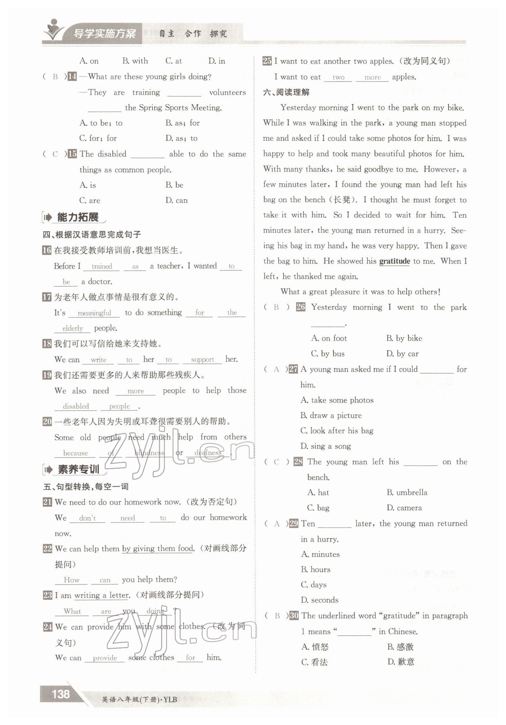注:目前有些书本章节名称可能整理的还不是很完善,但都是按照顺序排列的,请同学们按照顺序仔细查找。练习册 2022年三段六步导学测评八年级英语下册译林版 答案主要是用来给同学们做完题方便对答案用的,请勿直接抄袭。