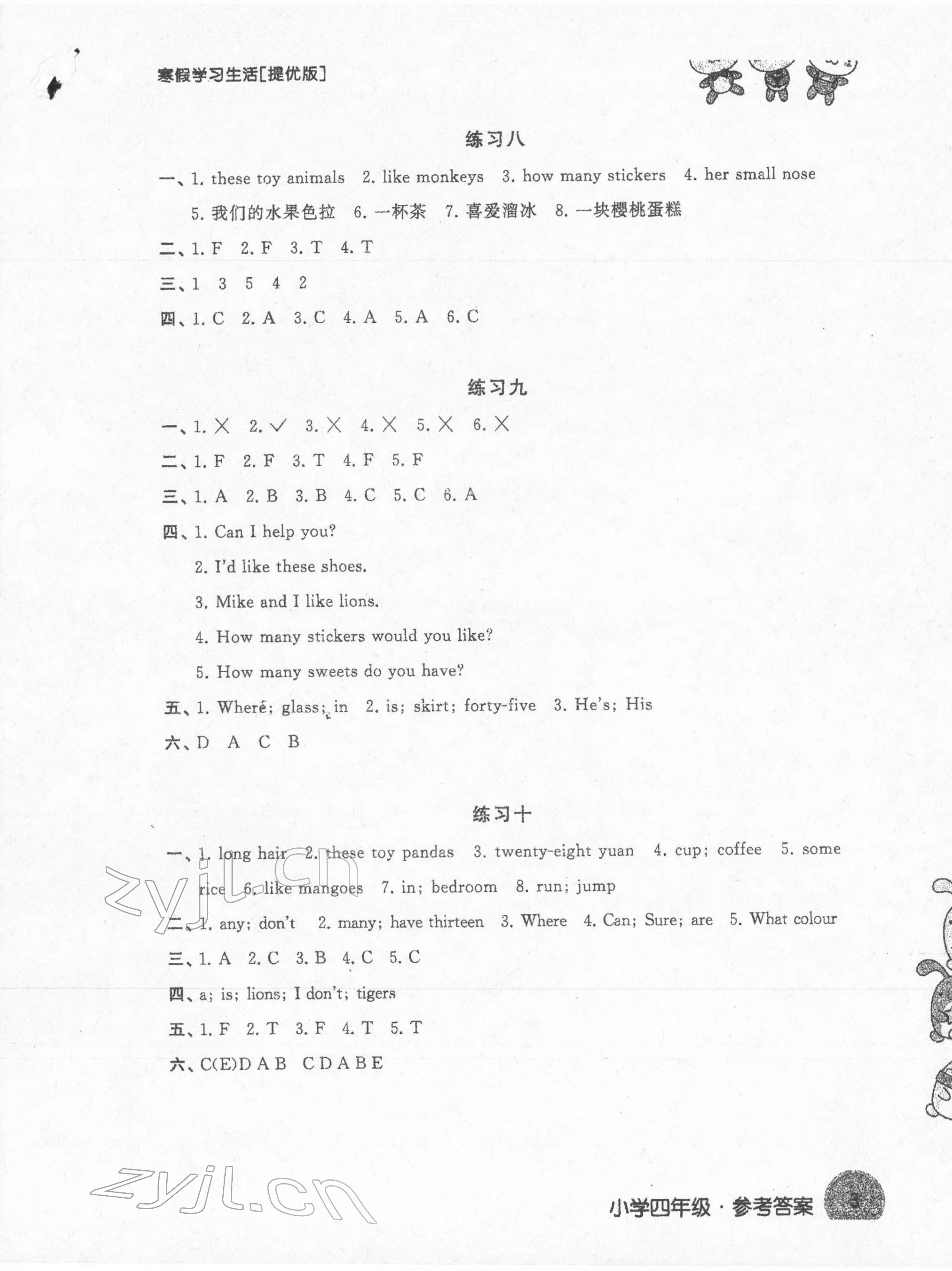注:目前有些书本章节名称可能整理的还不是很完善,但都是按照顺序排列的,请同学们按照顺序仔细查找。练习册 2022年寒假学习生活四年级英语提优版 答案主要是用来给同学们做完题方便对答案用的,请勿直接抄袭。