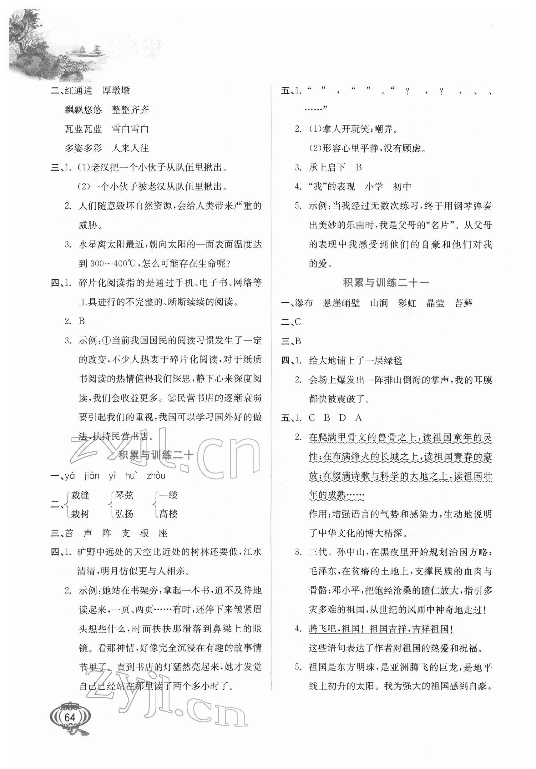 注:目前有些书本章节名称可能整理的还不是很完善,但都是按照顺序排列的,请同学们按照顺序仔细查找。练习册 2022年寒假字词句与阅读训练六年级语文人教版 答案主要是用来给同学们做完题方便对答案用的,请勿直接抄袭。
