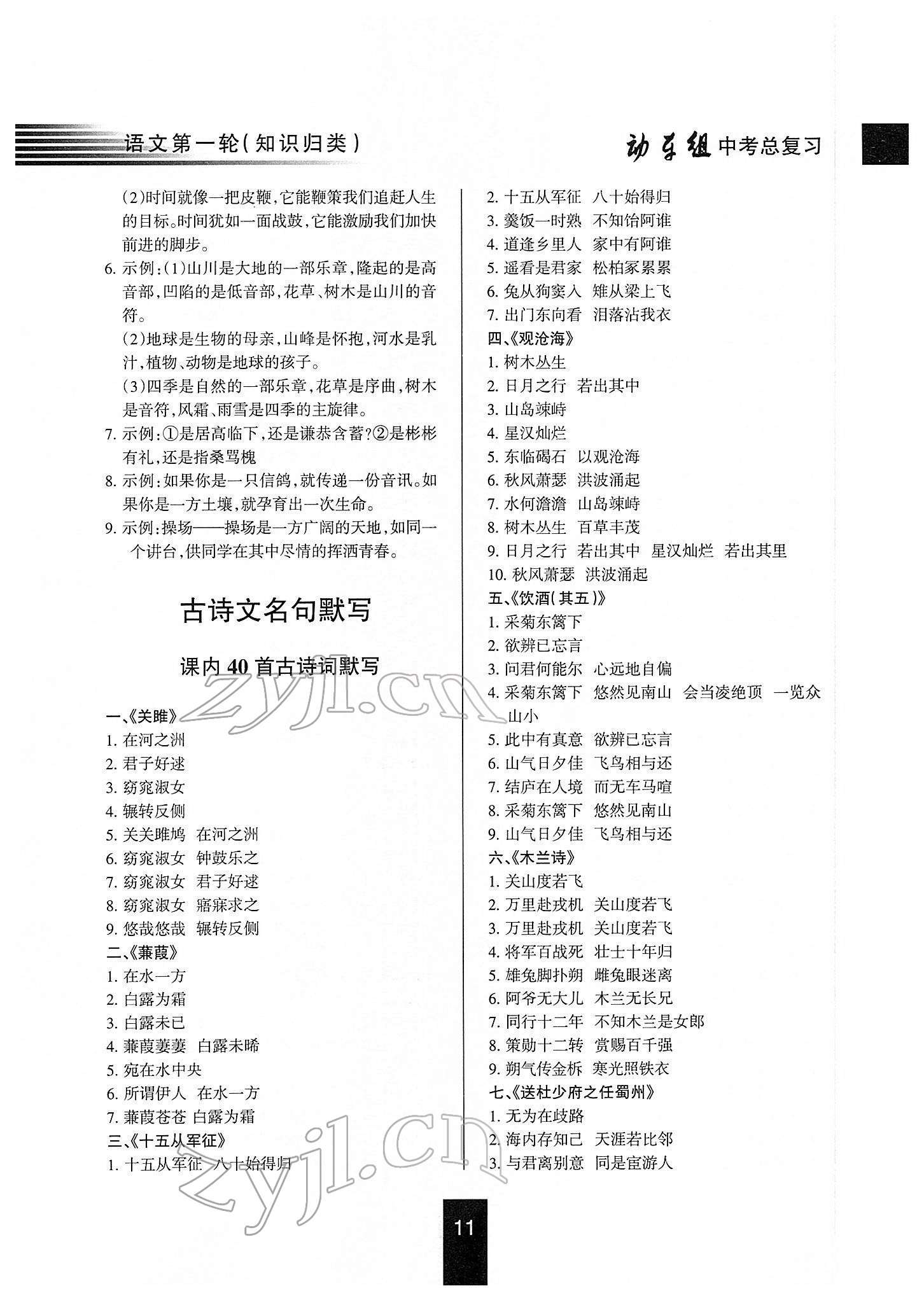 注:目前有些书本章节名称可能整理的还不是很完善,但都是按照顺序排列的,请同学们按照顺序仔细查找。练习册 2022年动车组中考总复习语文第一轮知识归类人教版 答案主要是用来给同学们做完题方便对答案用的,请勿直接抄袭。