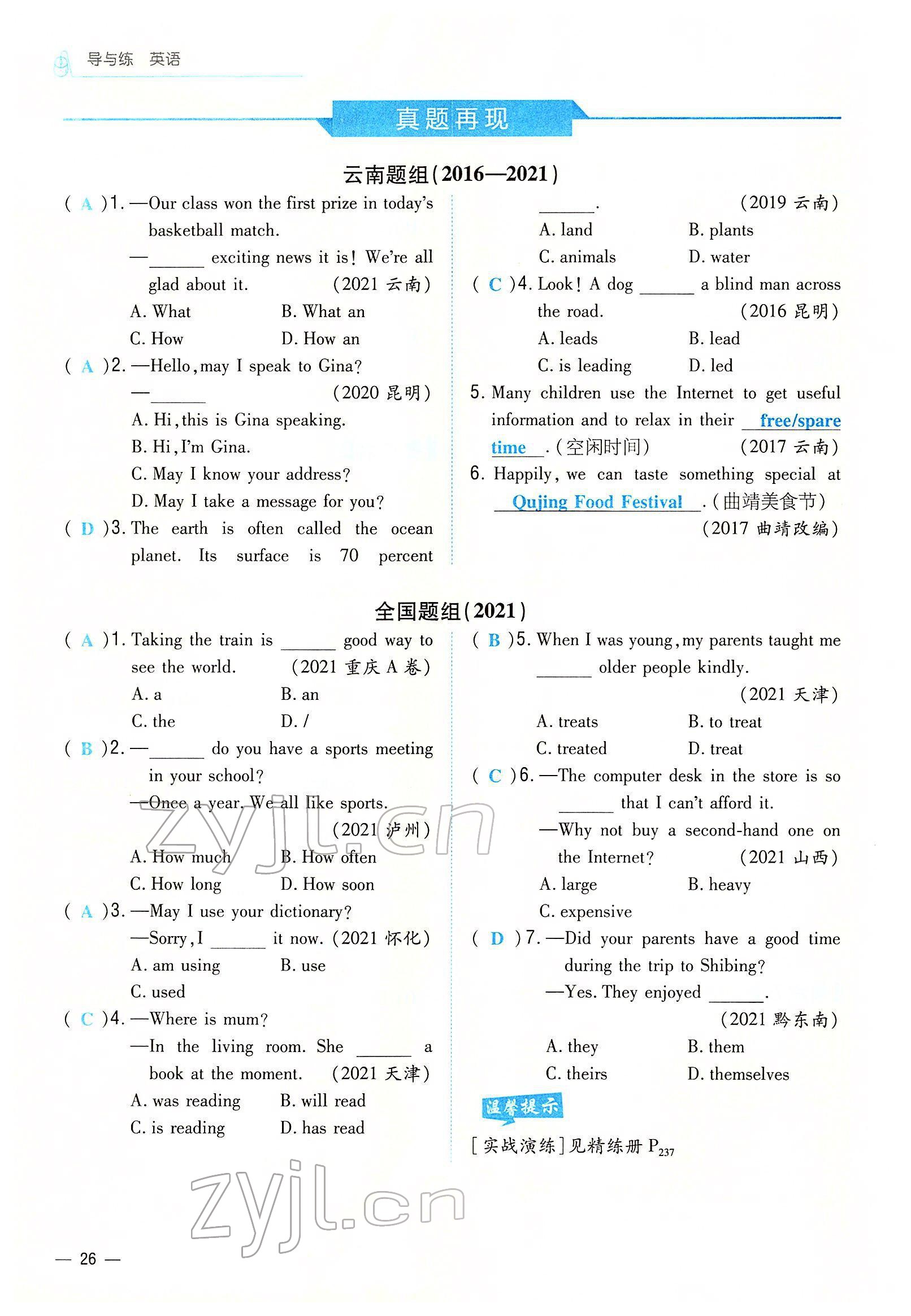 注:目前有些书本章节名称可能整理的还不是很完善,但都是按照顺序排列的,请同学们按照顺序仔细查找。练习册 2022年云南省初中学业水平考试导与练英语云南专版 答案主要是用来给同学们做完题方便对答案用的,请勿直接抄袭。