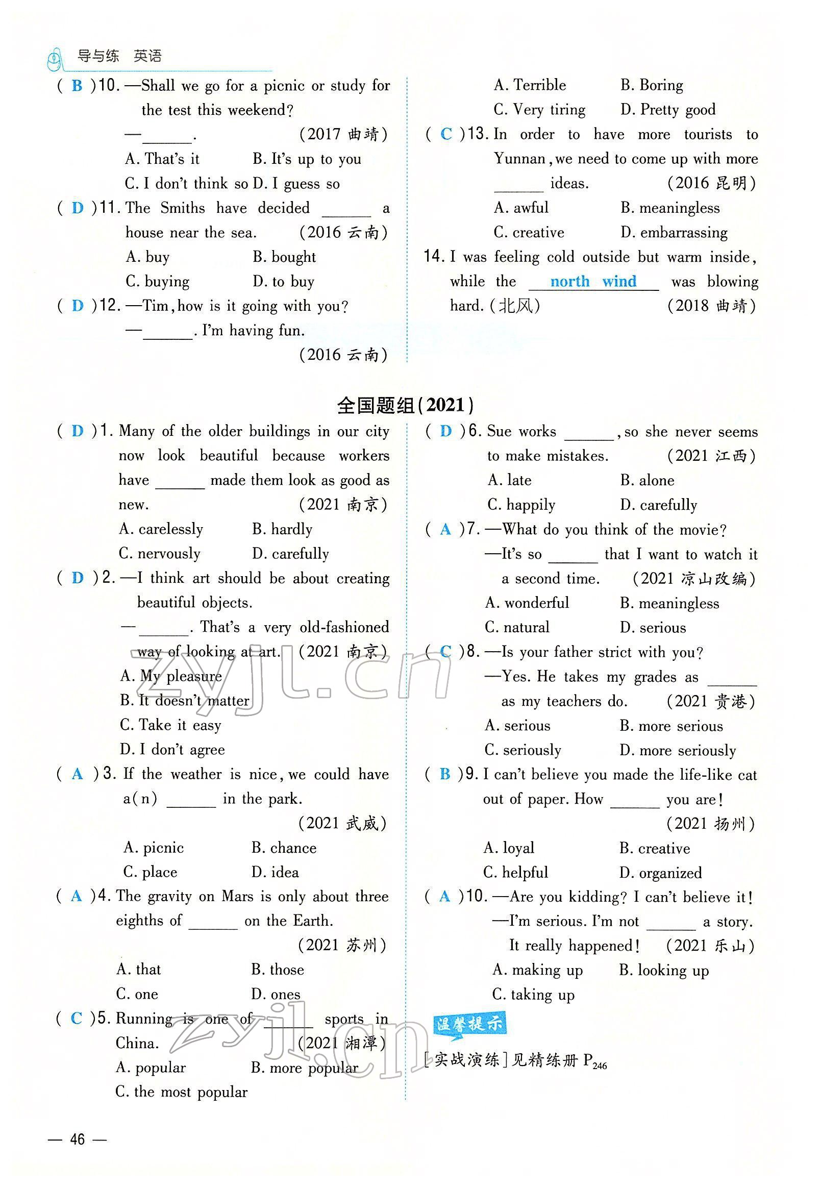 注:目前有些书本章节名称可能整理的还不是很完善,但都是按照顺序排列的,请同学们按照顺序仔细查找。练习册 2022年云南省初中学业水平考试导与练英语云南专版 答案主要是用来给同学们做完题方便对答案用的,请勿直接抄袭。