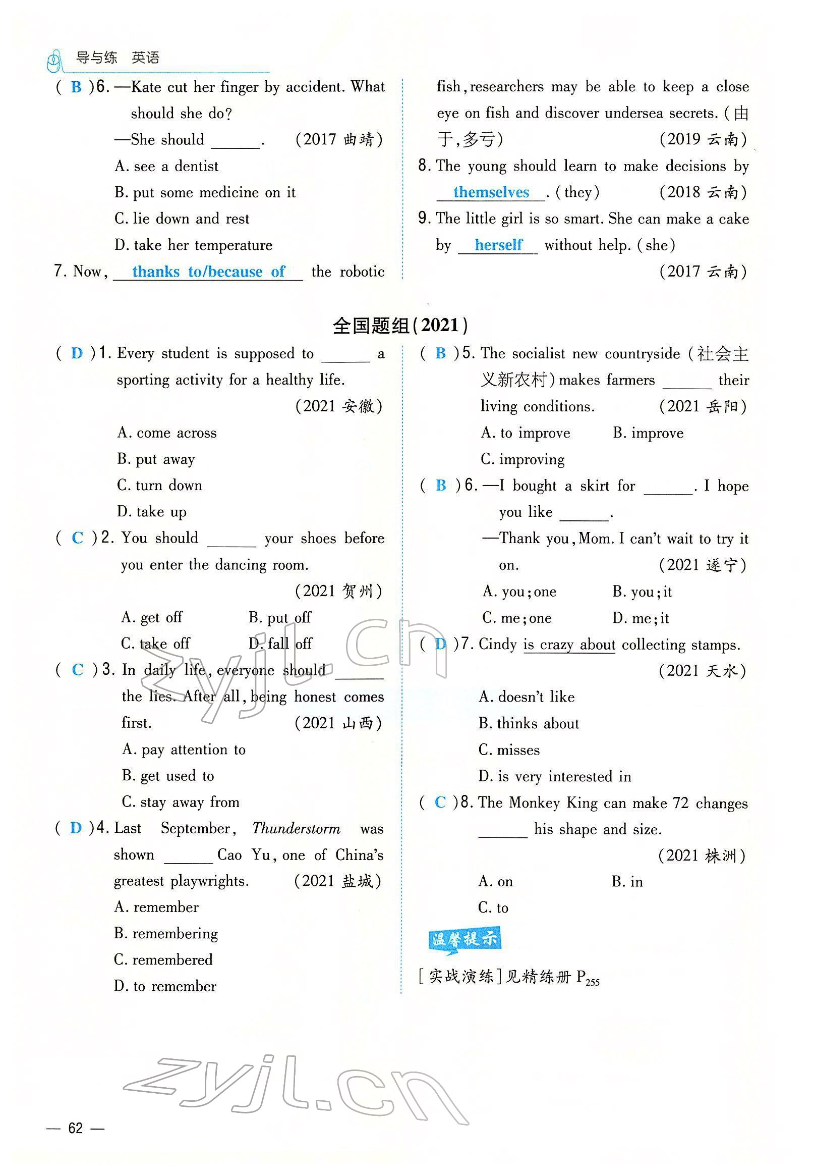 注:目前有些书本章节名称可能整理的还不是很完善,但都是按照顺序排列的,请同学们按照顺序仔细查找。练习册 2022年云南省初中学业水平考试导与练英语云南专版 答案主要是用来给同学们做完题方便对答案用的,请勿直接抄袭。
