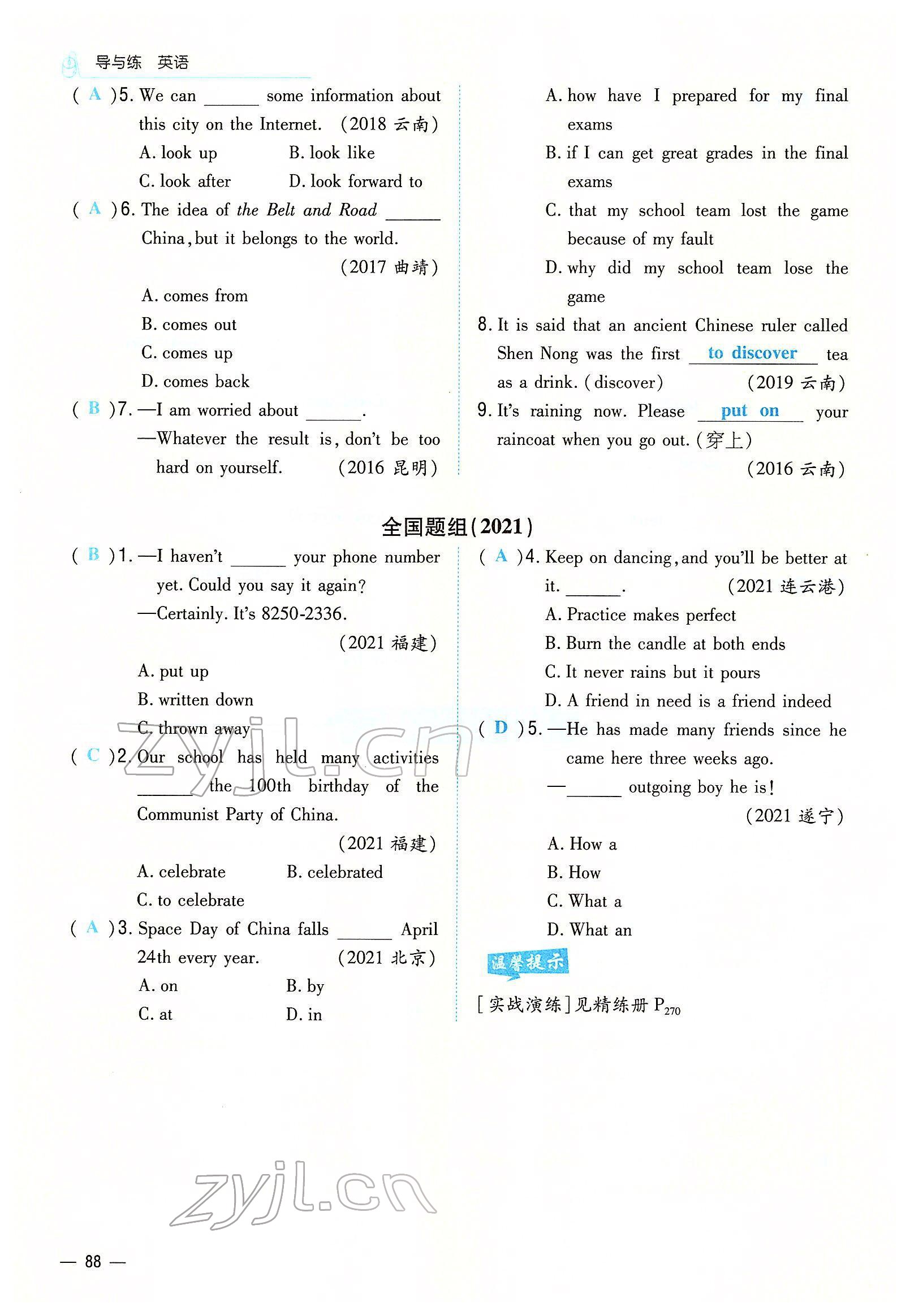 注:目前有些书本章节名称可能整理的还不是很完善,但都是按照顺序排列的,请同学们按照顺序仔细查找。练习册 2022年云南省初中学业水平考试导与练英语云南专版 答案主要是用来给同学们做完题方便对答案用的,请勿直接抄袭。