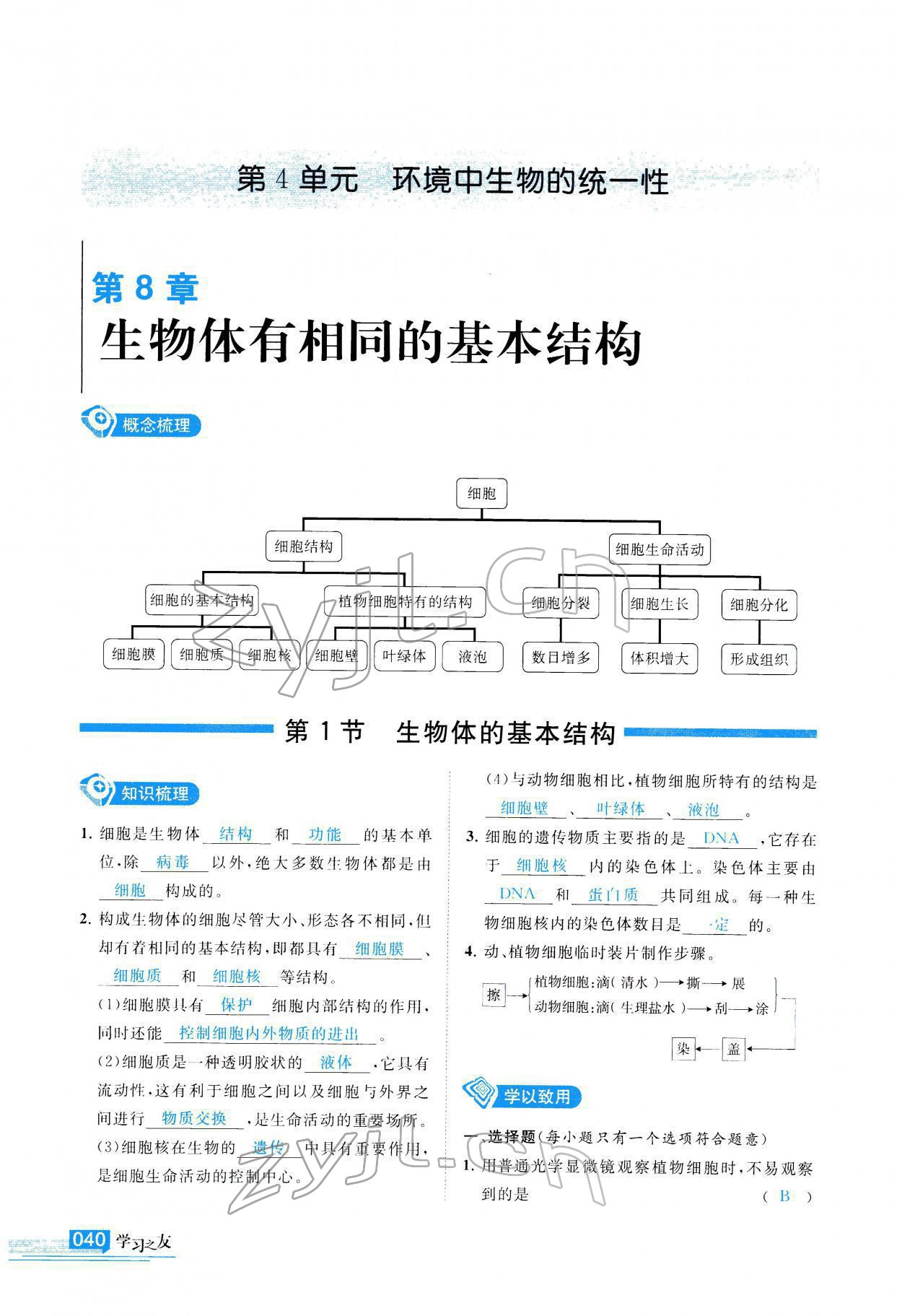 注:目前有些书本章节名称可能整理的还不是很完善,但都是按照顺序排列的,请同学们按照顺序仔细查找。练习册 2022年学习之友七年级生物全一册苏科版 答案主要是用来给同学们做完题方便对答案用的,请勿直接抄袭。
