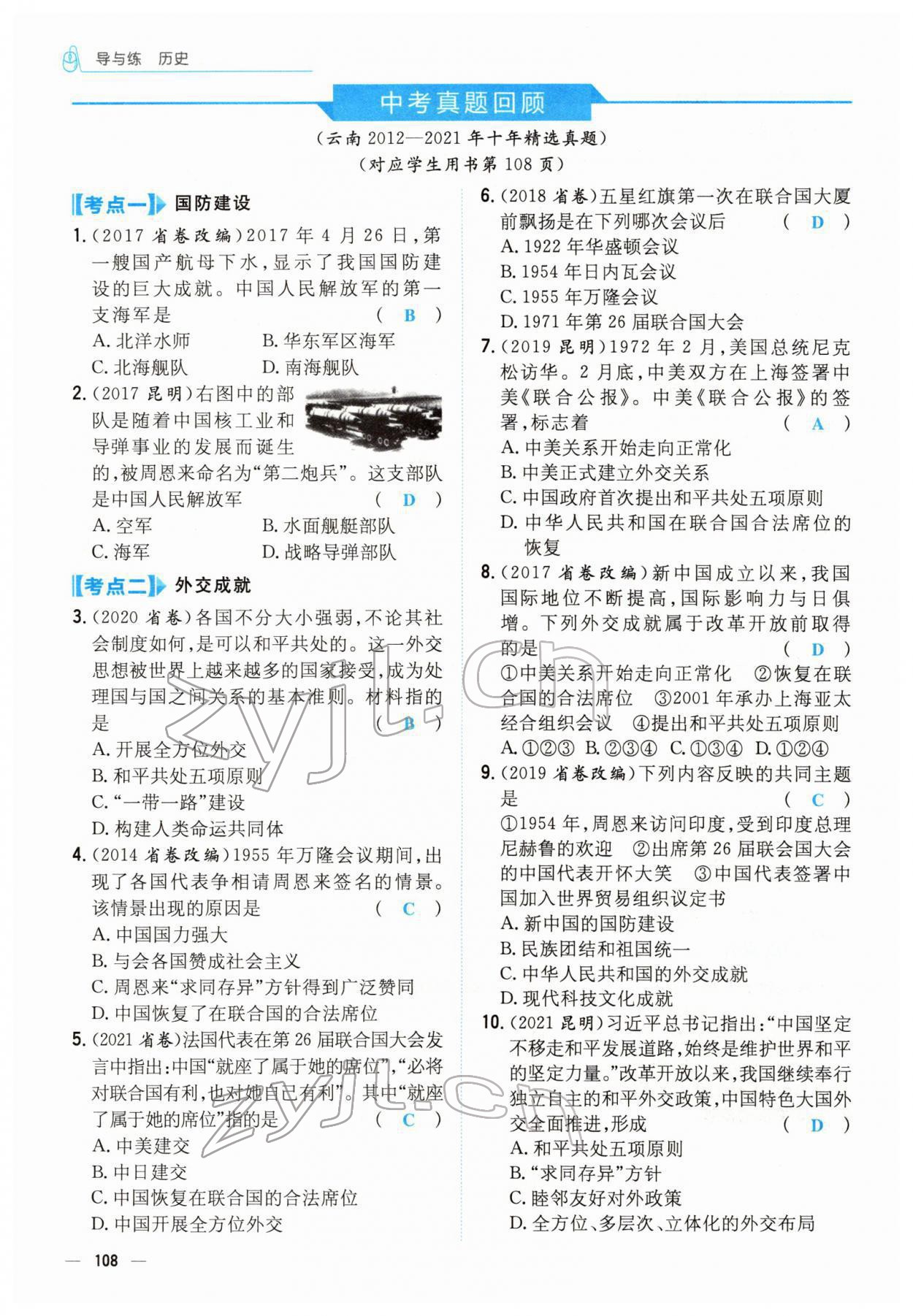注:目前有些书本章节名称可能整理的还不是很完善,但都是按照顺序排列的,请同学们按照顺序仔细查找。练习册 2022年云南省初中学业水平考试导与练历史云南专版 答案主要是用来给同学们做完题方便对答案用的,请勿直接抄袭。