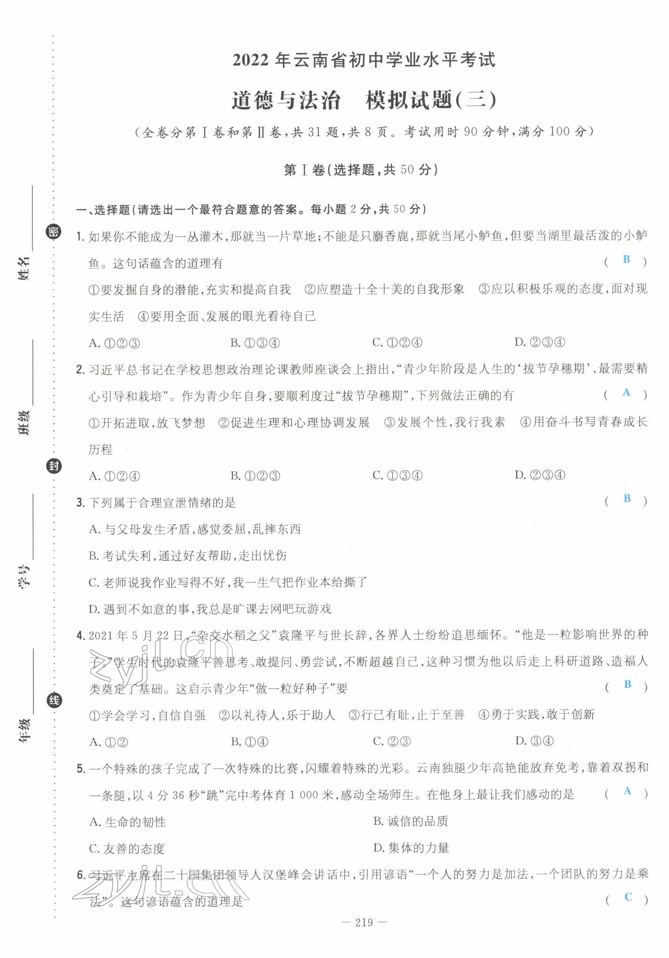 2022年云南省初中学业水平考试导与练道德与法治云南专版