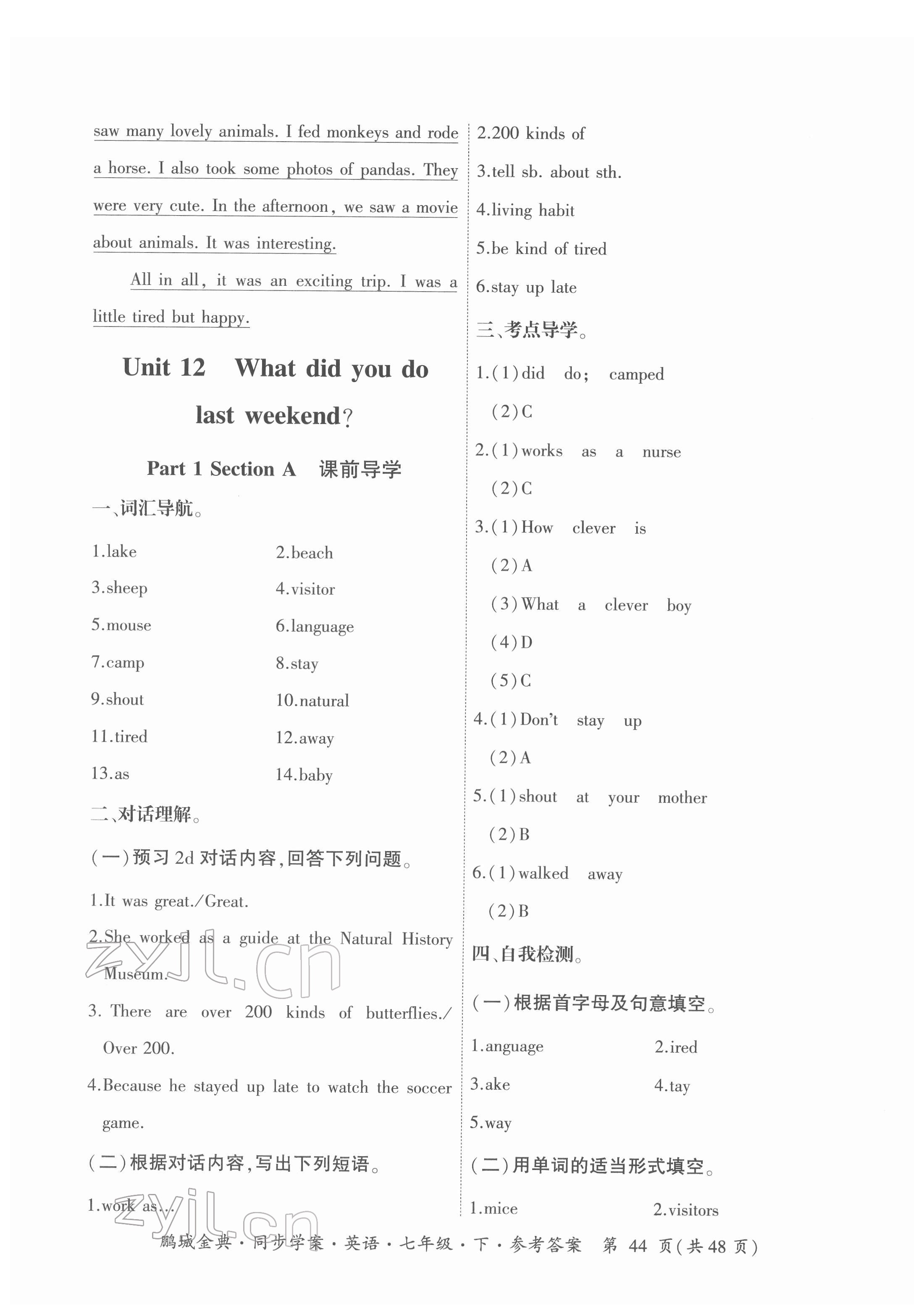注:目前有些书本章节名称可能整理的还不是很完善,但都是按照顺序排列的,请同学们按照顺序仔细查找。练习册 2022年名师帮同步学案七年级英语下册人教版广东专版 答案主要是用来给同学们做完题方便对答案用的,请勿直接抄袭。