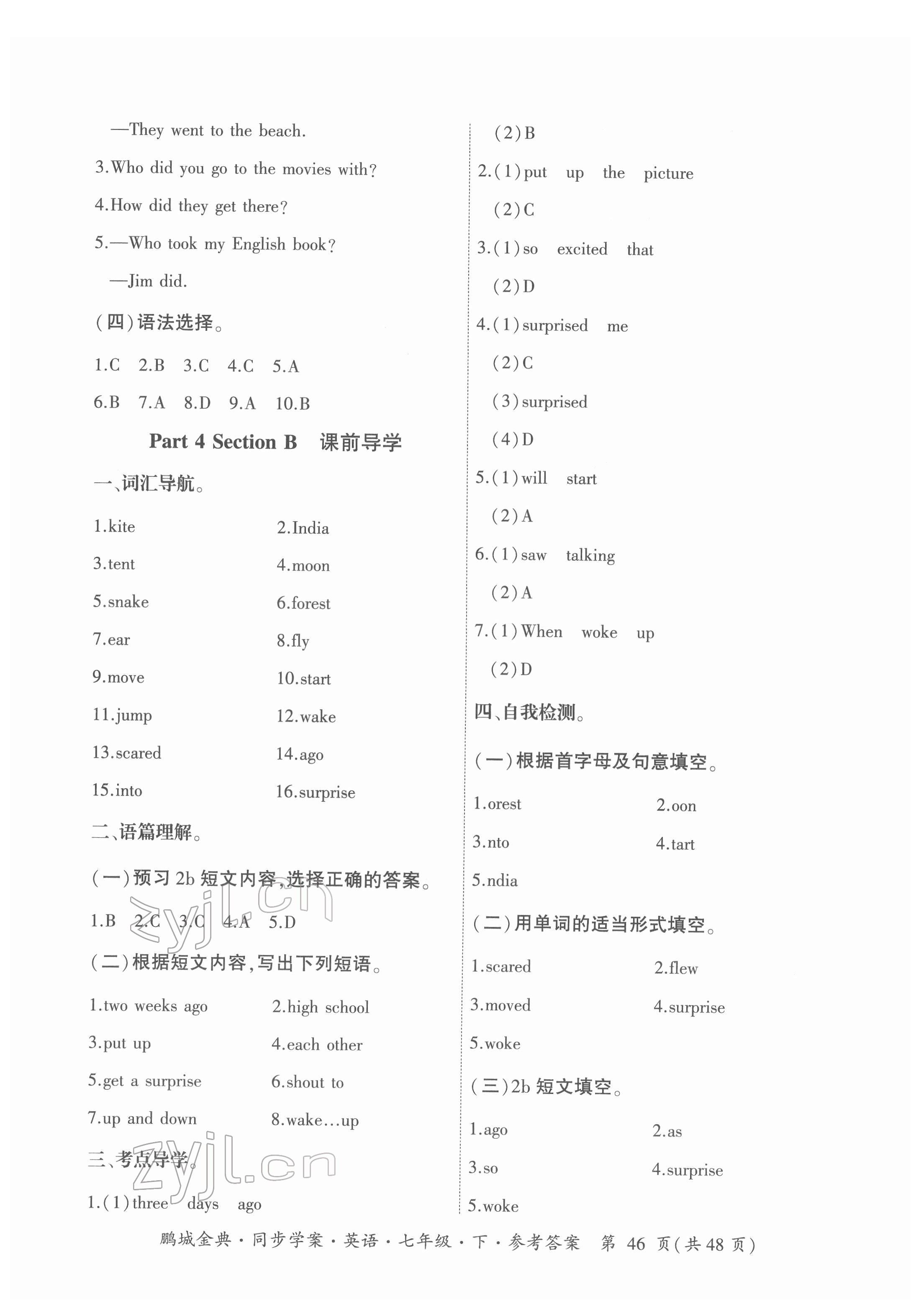 注:目前有些书本章节名称可能整理的还不是很完善,但都是按照顺序排列的,请同学们按照顺序仔细查找。练习册 2022年名师帮同步学案七年级英语下册人教版广东专版 答案主要是用来给同学们做完题方便对答案用的,请勿直接抄袭。