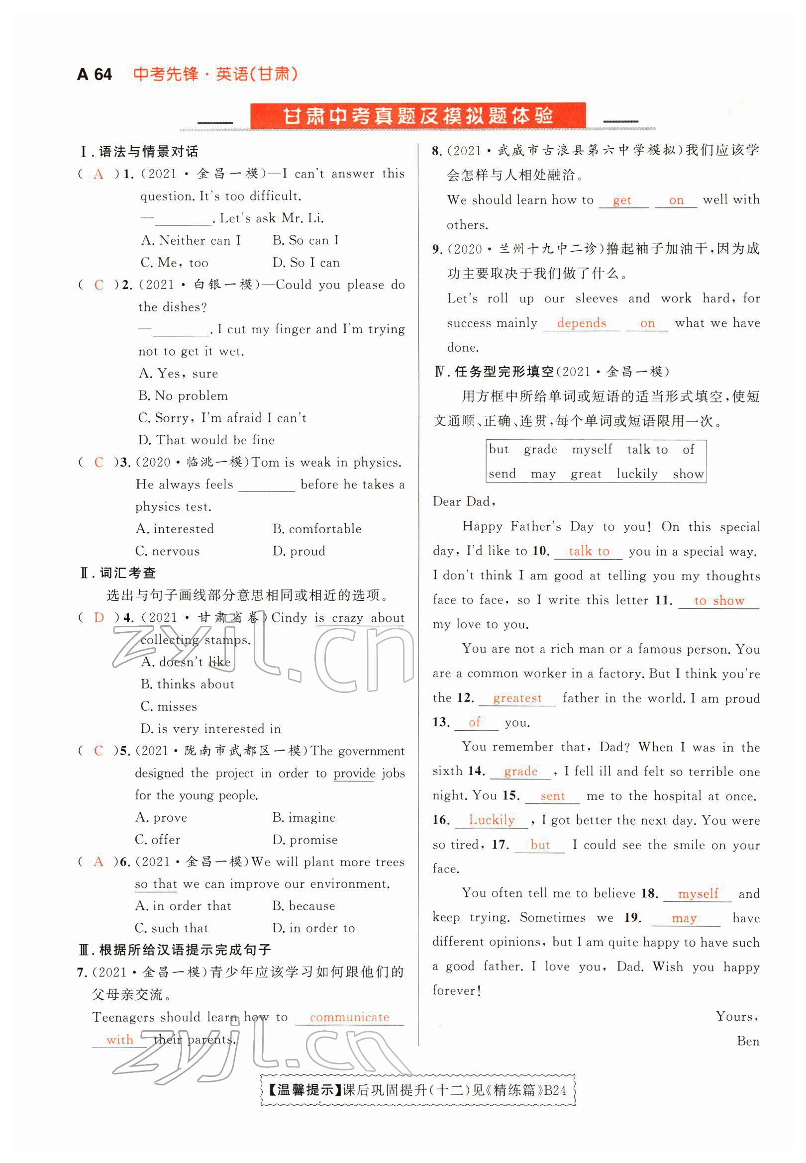 注:目前有些书本章节名称可能整理的还不是很完善,但都是按照顺序排列的,请同学们按照顺序仔细查找。练习册 2022年中考先锋英语甘肃专版吉林出版集团 答案主要是用来给同学们做完题方便对答案用的,请勿直接抄袭。