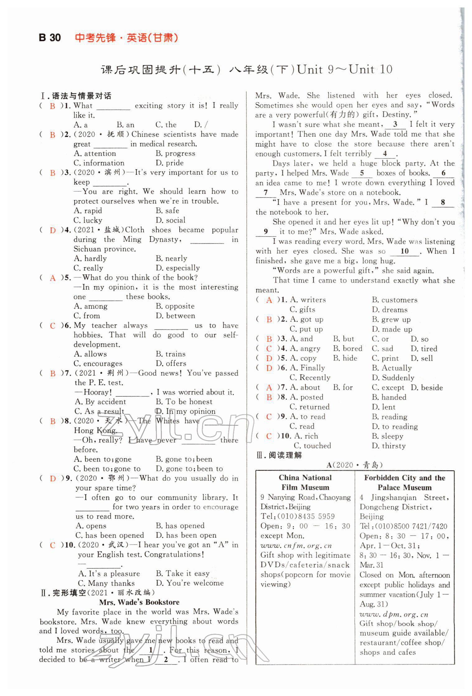 注:目前有些书本章节名称可能整理的还不是很完善,但都是按照顺序排列的,请同学们按照顺序仔细查找。练习册 2022年中考先锋英语甘肃专版吉林出版集团 答案主要是用来给同学们做完题方便对答案用的,请勿直接抄袭。