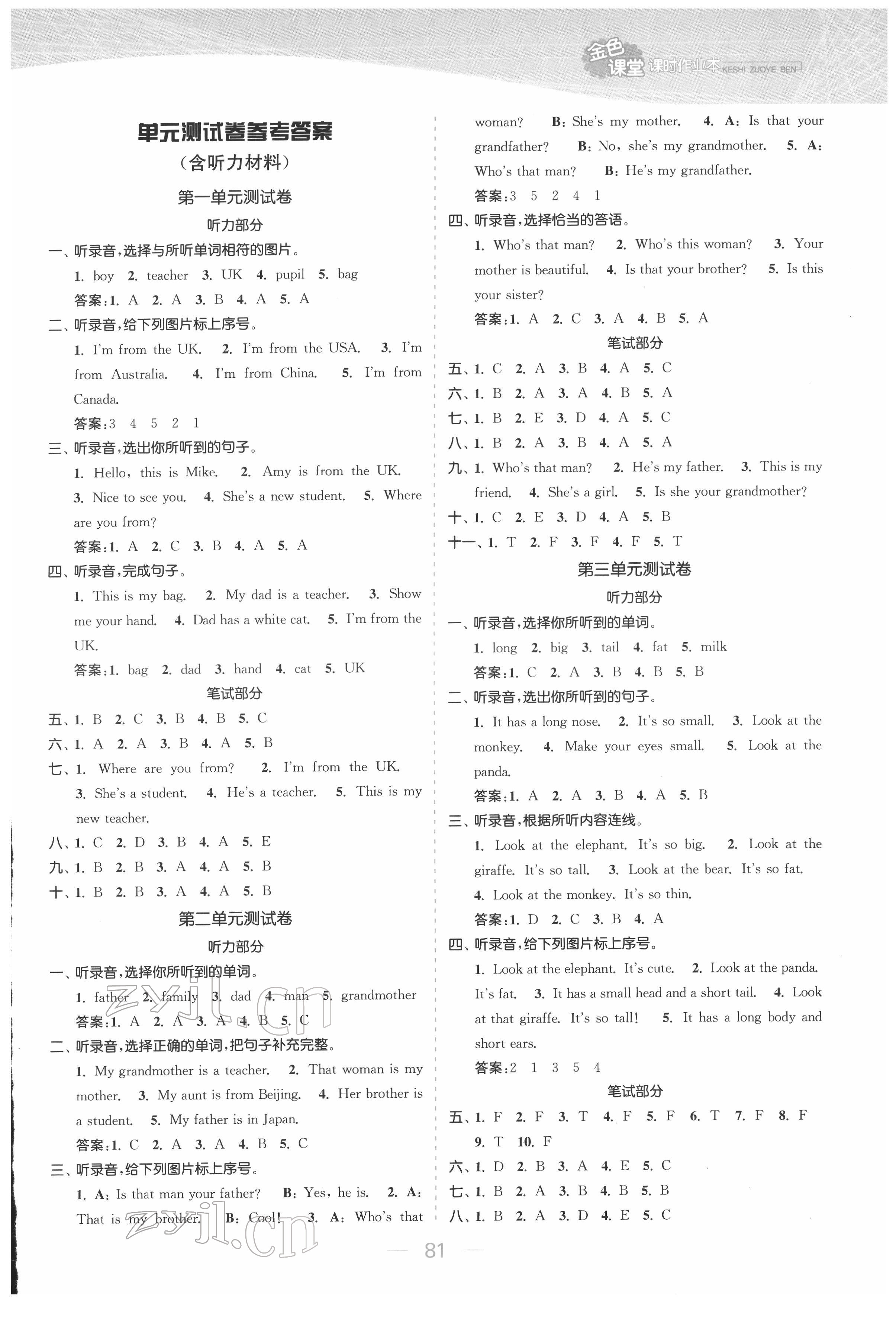 注:目前有些书本章节名称可能整理的还不是很完善,但都是按照顺序排列的,请同学们按照顺序仔细查找。练习册 2022年金色课堂课时作业本三年级英语下册人教版 答案主要是用来给同学们做完题方便对答案用的,请勿直接抄袭。