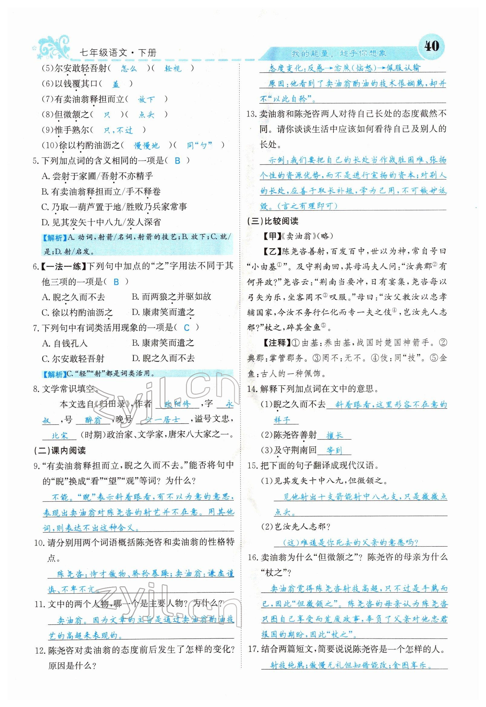 注:目前有些书本章节名称可能整理的还不是很完善,但都是按照顺序排列的,请同学们按照顺序仔细查找。练习册 2022年课堂点睛七年级语文下册人教版山西专版 答案主要是用来给同学们做完题方便对答案用的,请勿直接抄袭。