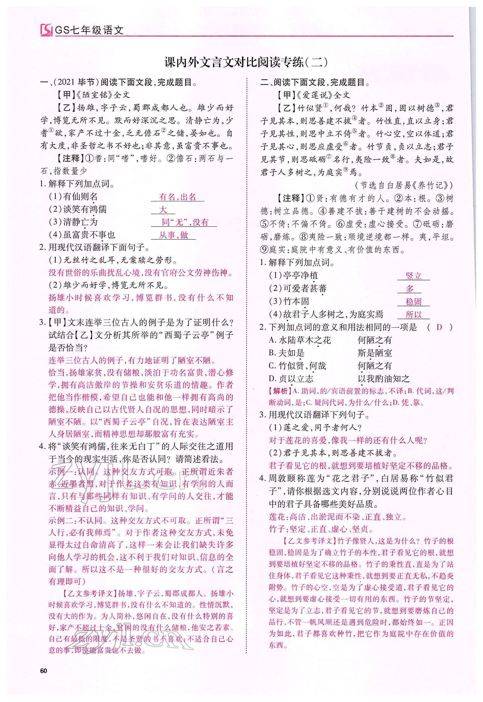 注:目前有些书本章节名称可能整理的还不是很完善,但都是按照顺序排列的,请同学们按照顺序仔细查找。练习册 2022年我的作业七年级语文下册人教版甘肃专版 答案主要是用来给同学们做完题方便对答案用的,请勿直接抄袭。