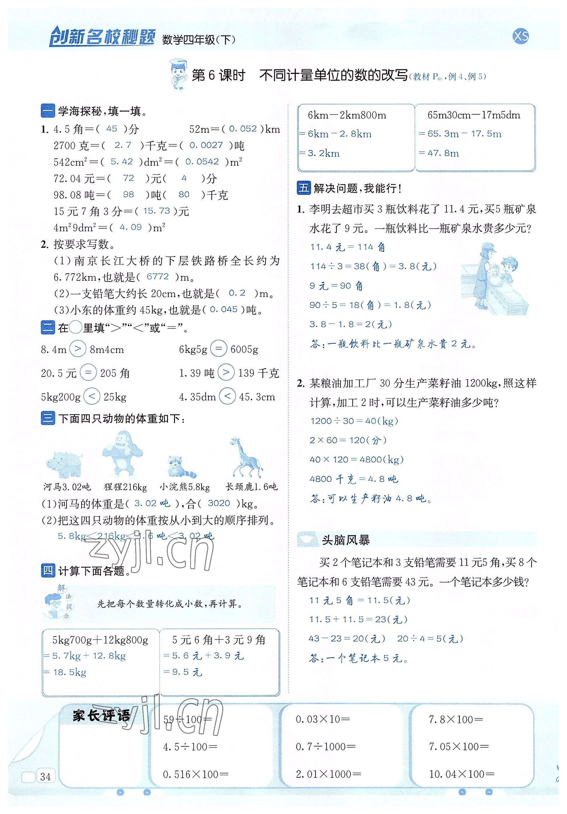 注:目前有些书本章节名称可能整理的还不是很完善,但都是按照顺序排列的,请同学们按照顺序仔细查找。练习册 2022年创新名校秘题四年级数学下册西师大版 答案主要是用来给同学们做完题方便对答案用的,请勿直接抄袭。