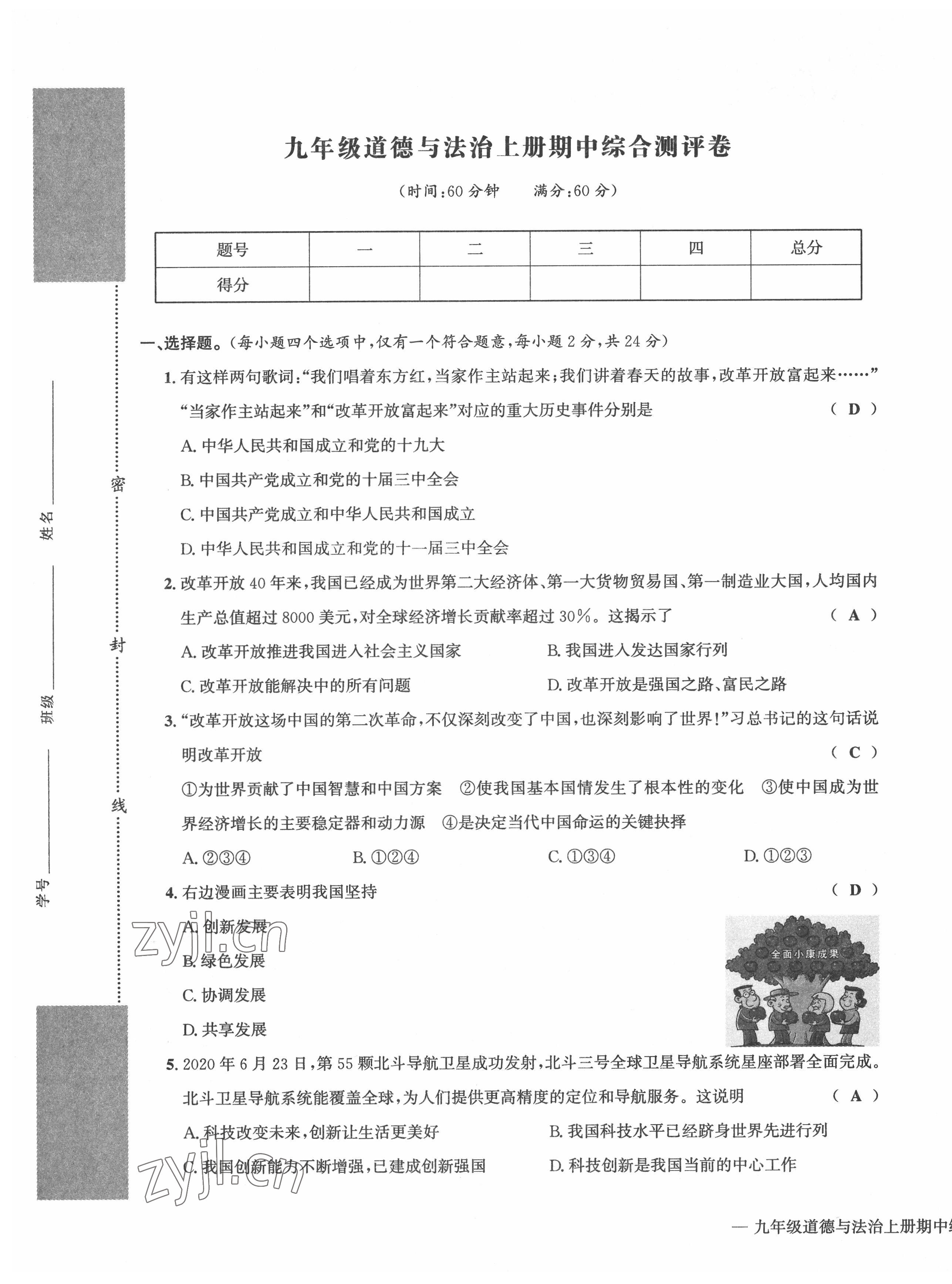 2022年学业评价测评卷九年级道德与法治全一册人教版