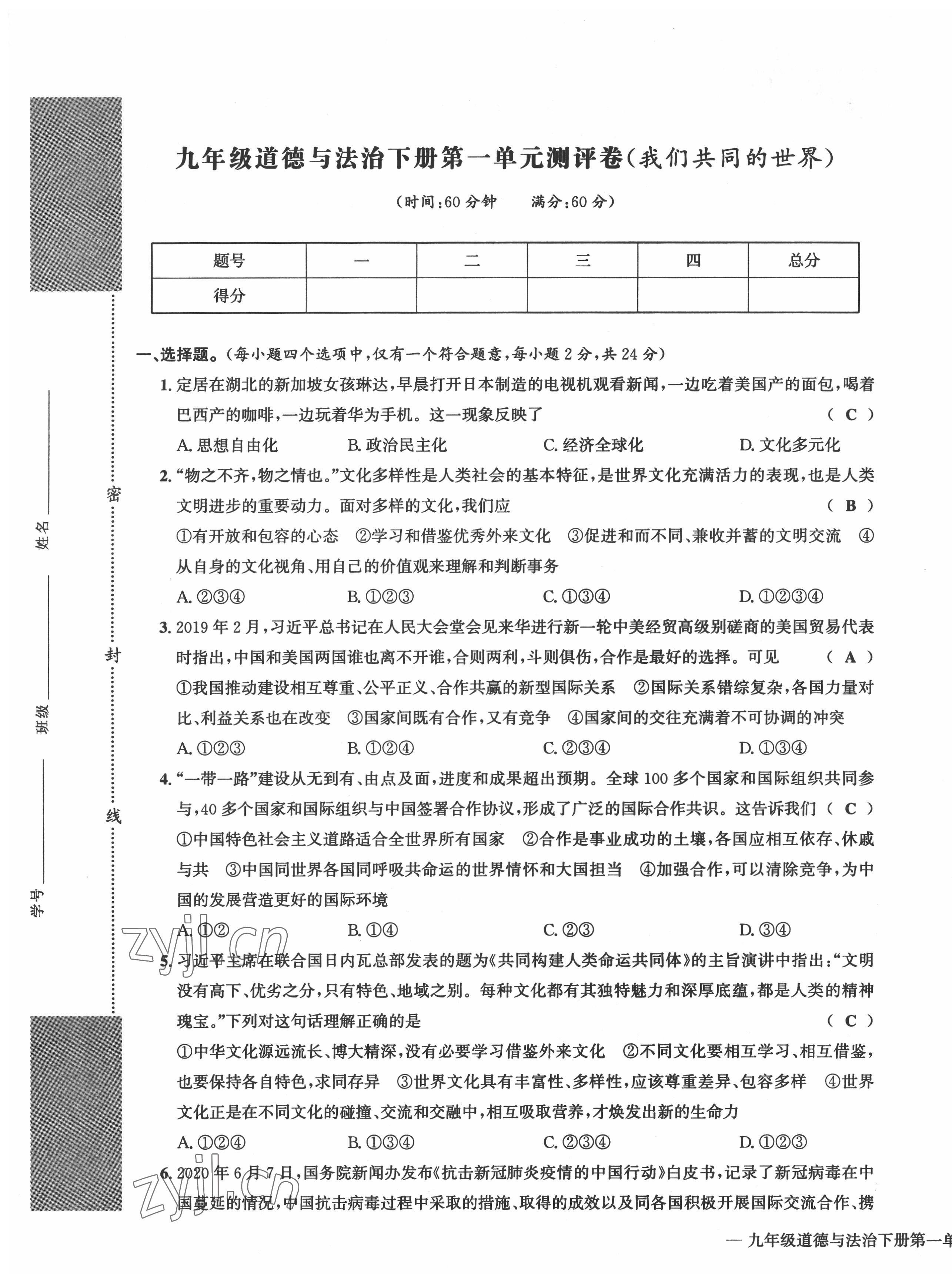 2022年学业评价测评卷九年级道德与法治全一册人教版