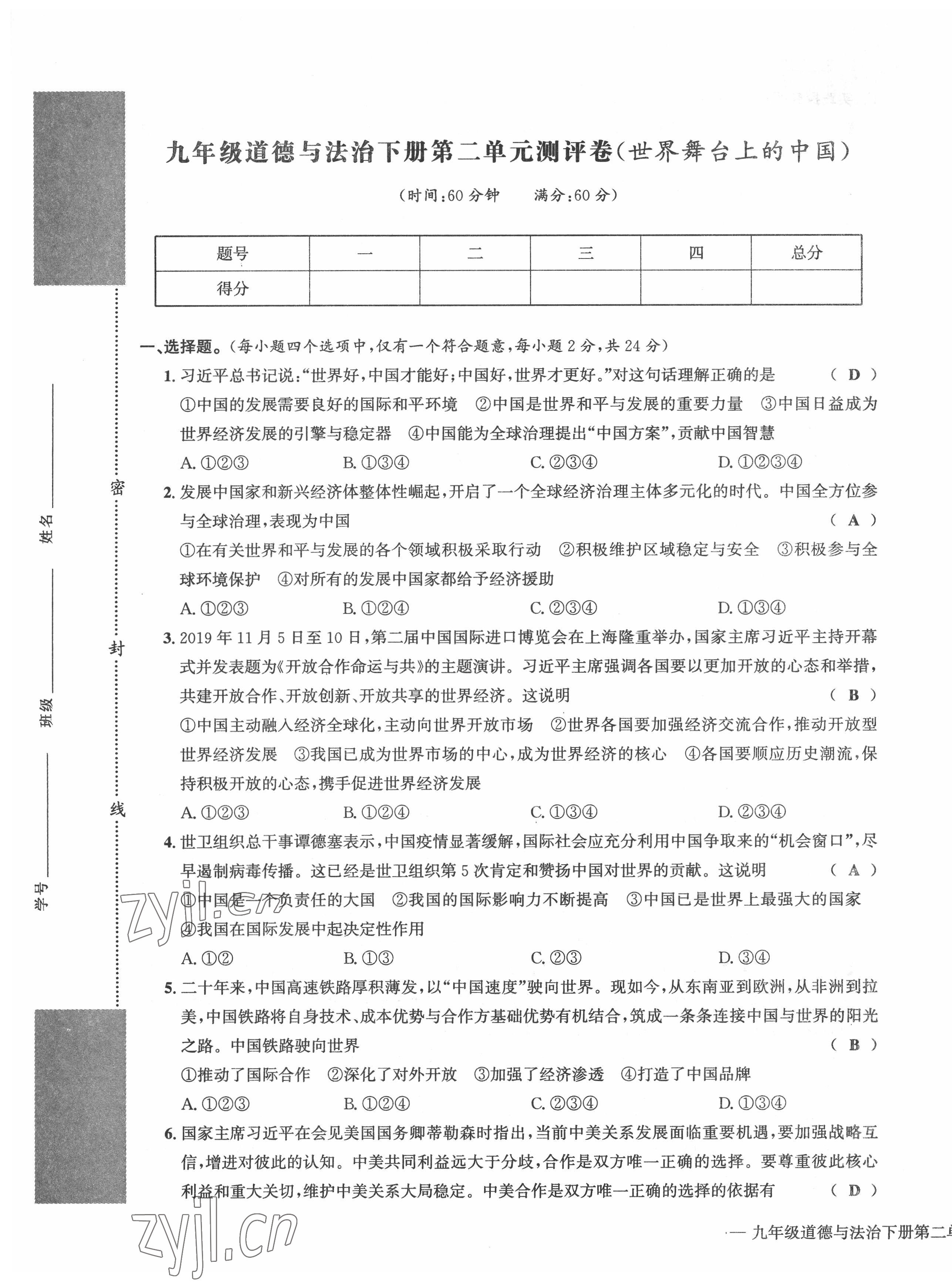 2022年学业评价测评卷九年级道德与法治全一册人教版