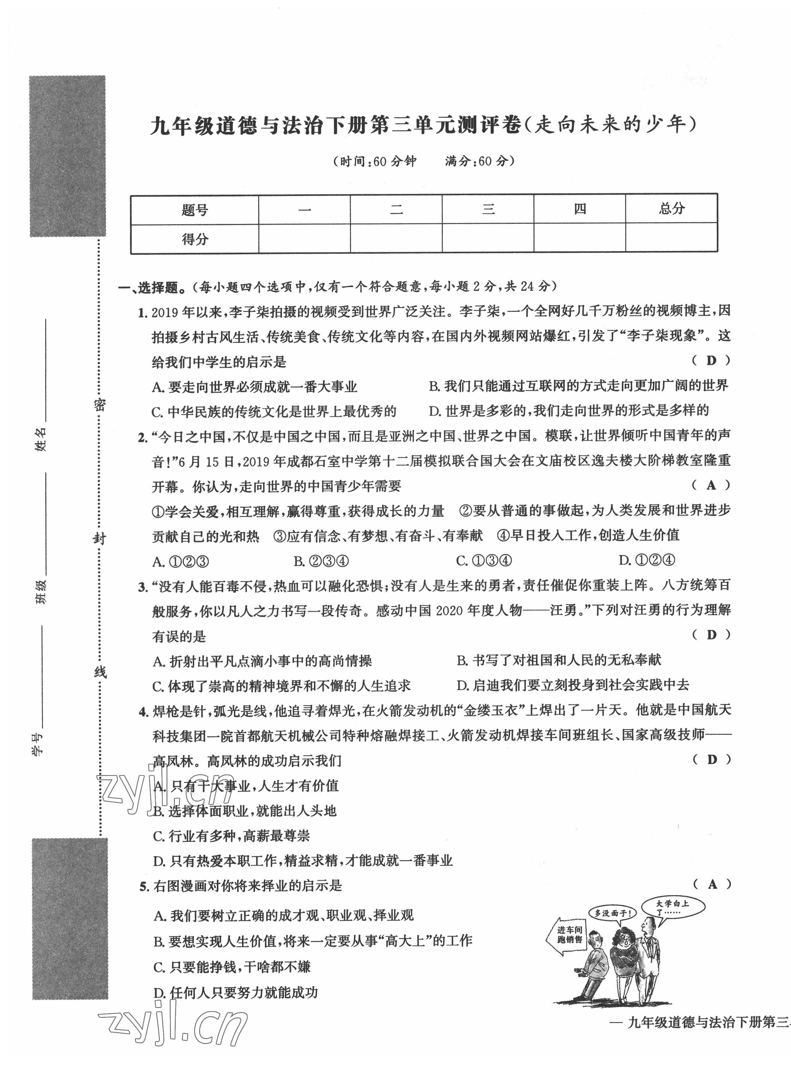 2022年学业评价测评卷九年级道德与法治全一册人教版