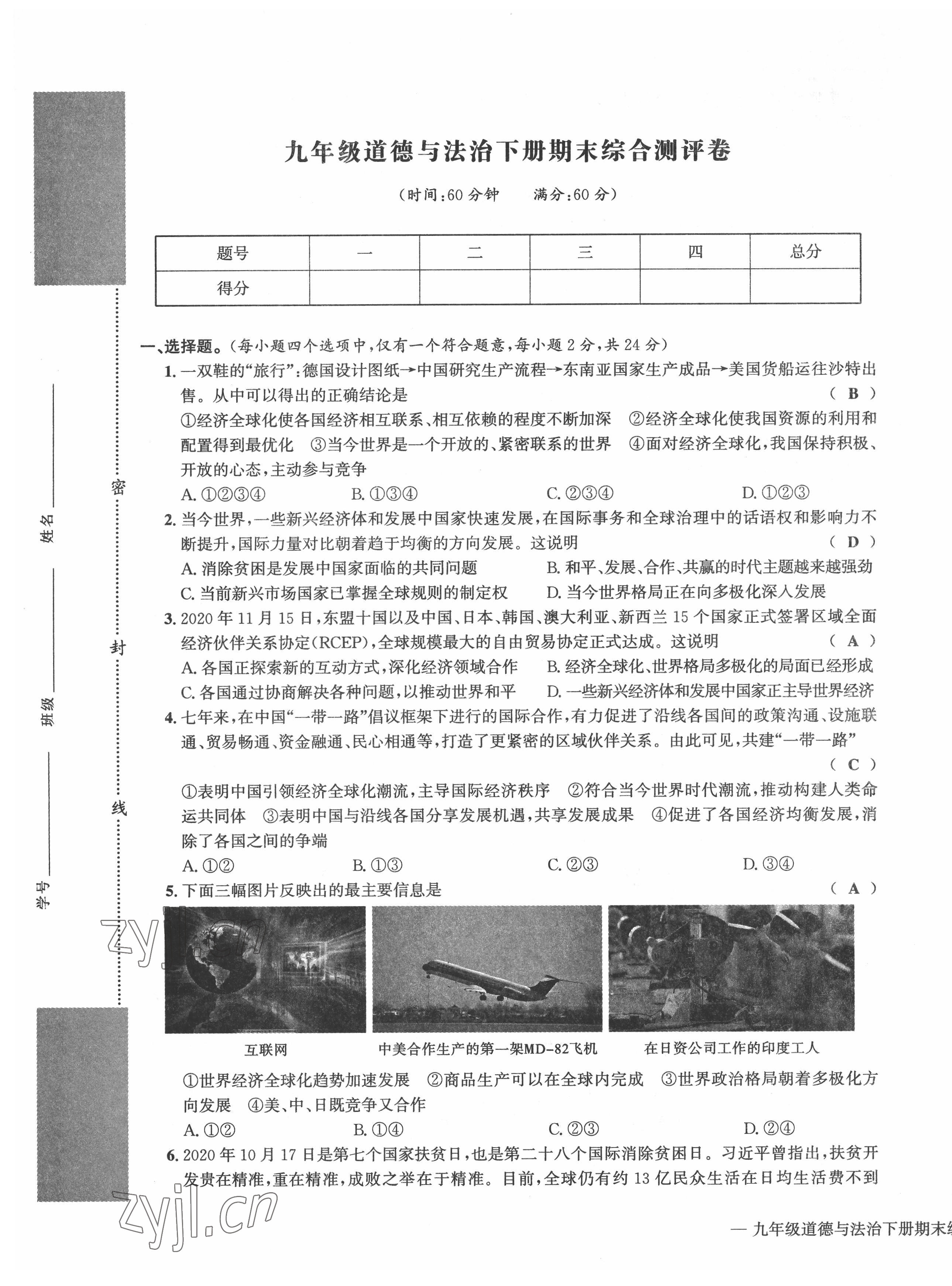 2022年学业评价测评卷九年级道德与法治全一册人教版