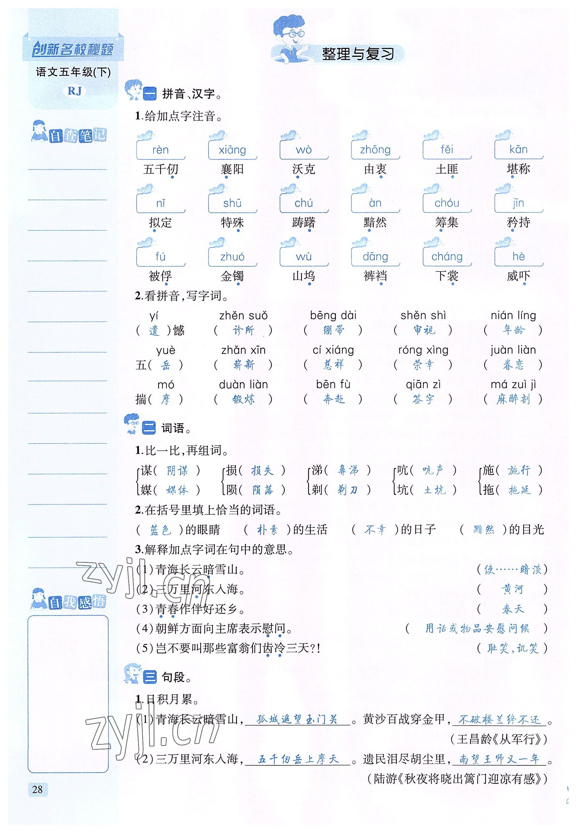 注:目前有些书本章节名称可能整理的还不是很完善,但都是按照顺序排列的,请同学们按照顺序仔细查找。练习册 2022年创新名校秘题五年级语文下册人教版 答案主要是用来给同学们做完题方便对答案用的,请勿直接抄袭。