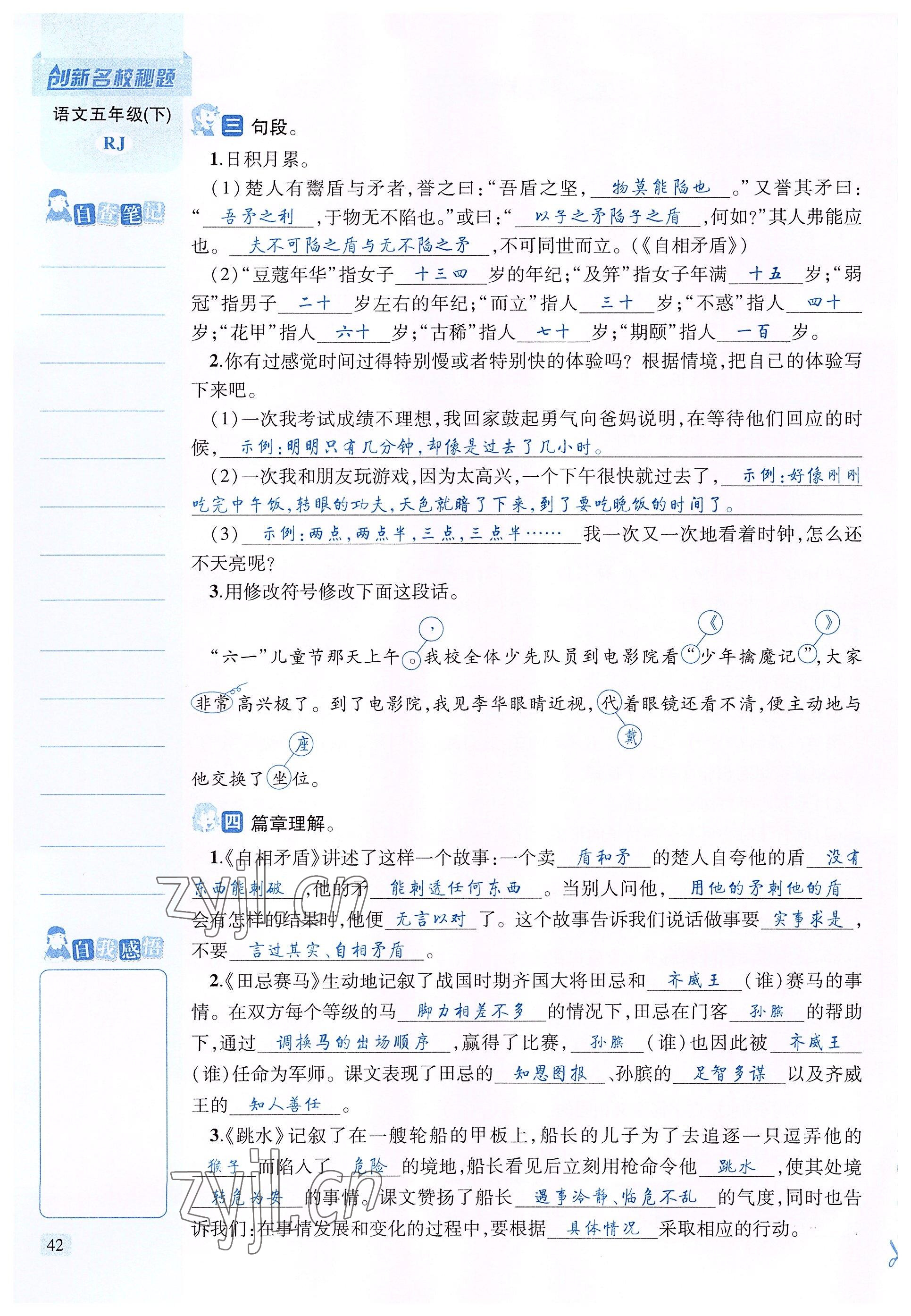 注:目前有些书本章节名称可能整理的还不是很完善,但都是按照顺序排列的,请同学们按照顺序仔细查找。练习册 2022年创新名校秘题五年级语文下册人教版 答案主要是用来给同学们做完题方便对答案用的,请勿直接抄袭。
