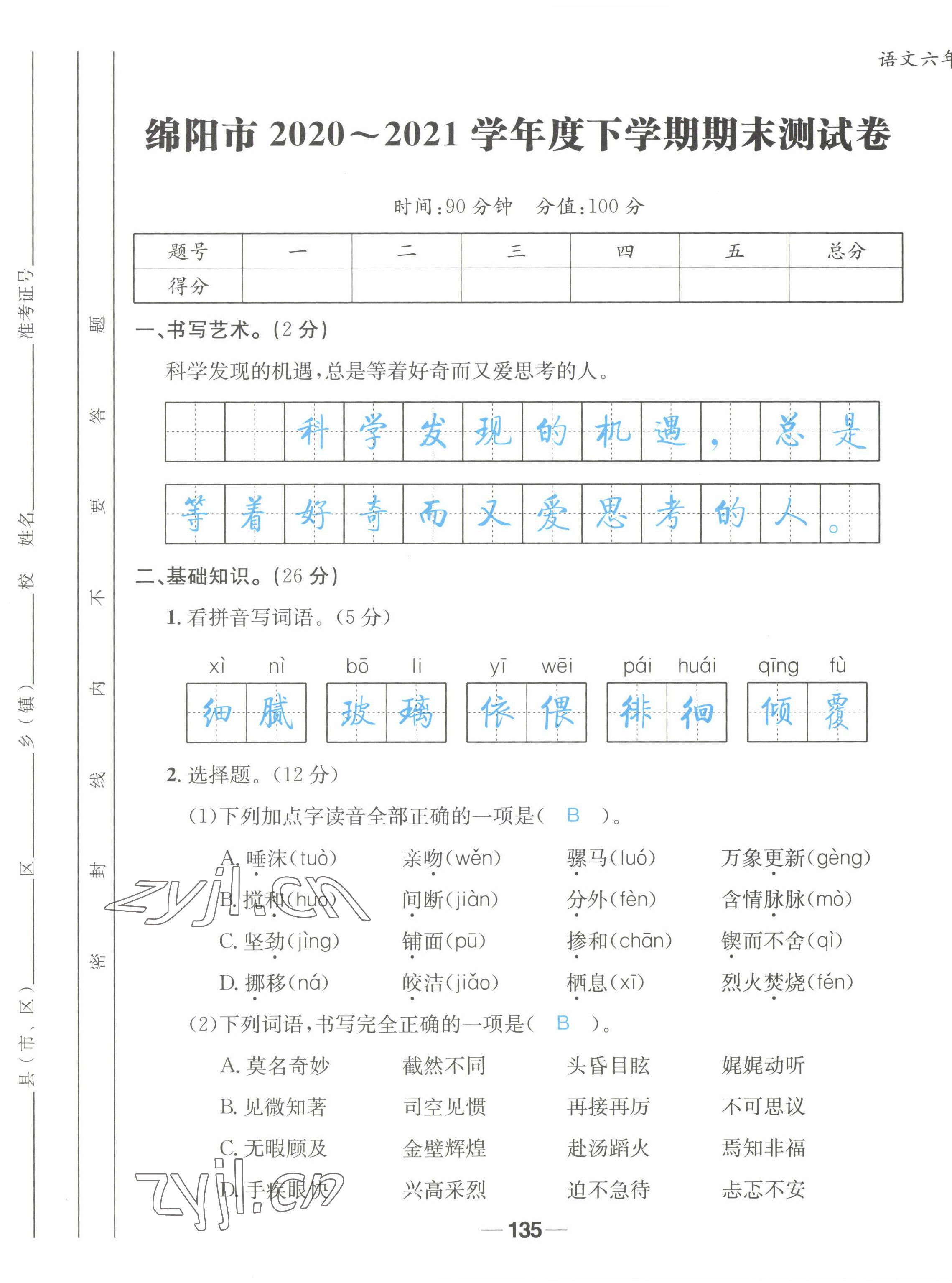 注:目前有些书本章节名称可能整理的还不是很完善,但都是按照顺序排列的,请同学们按照顺序仔细查找。练习册 2022年天府名校优课练六年级语文下册人教版 答案主要是用来给同学们做完题方便对答案用的,请勿直接抄袭。