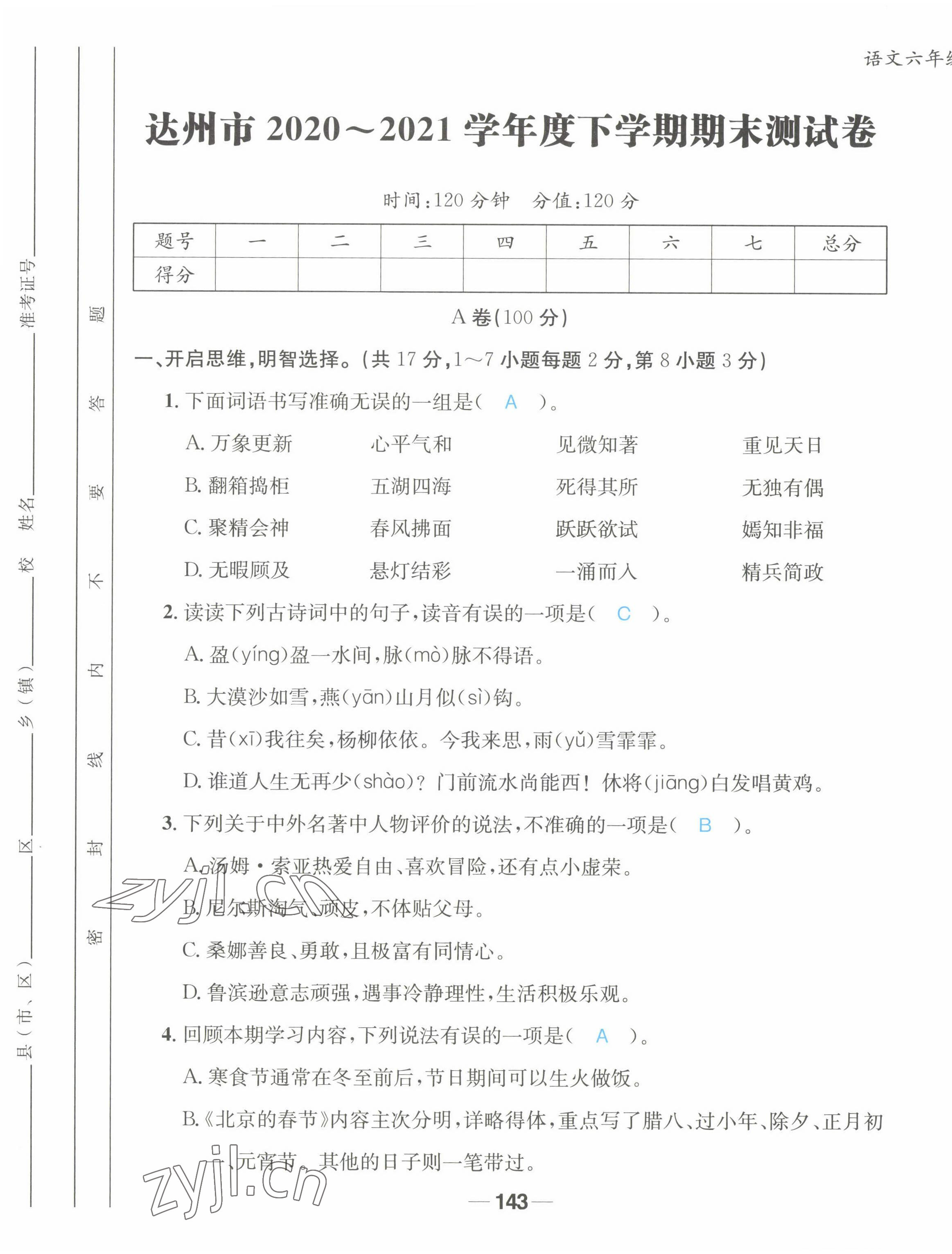 注:目前有些书本章节名称可能整理的还不是很完善,但都是按照顺序排列的,请同学们按照顺序仔细查找。练习册 2022年天府名校优课练六年级语文下册人教版 答案主要是用来给同学们做完题方便对答案用的,请勿直接抄袭。
