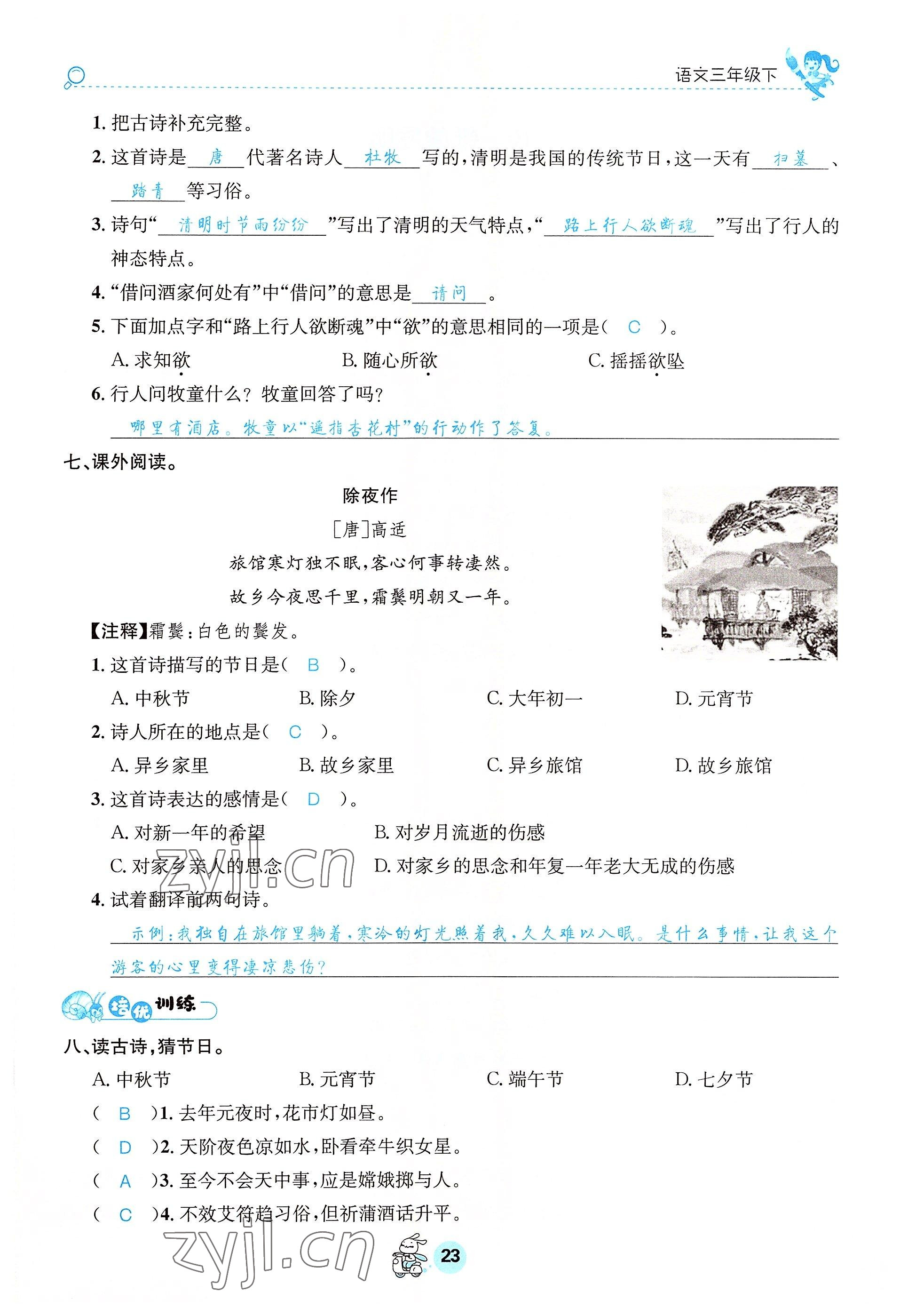注:目前有些书本章节名称可能整理的还不是很完善,但都是按照顺序排列的,请同学们按照顺序仔细查找。练习册 2022年天府名校优课练三年级语文下册人教版 答案主要是用来给同学们做完题方便对答案用的,请勿直接抄袭。