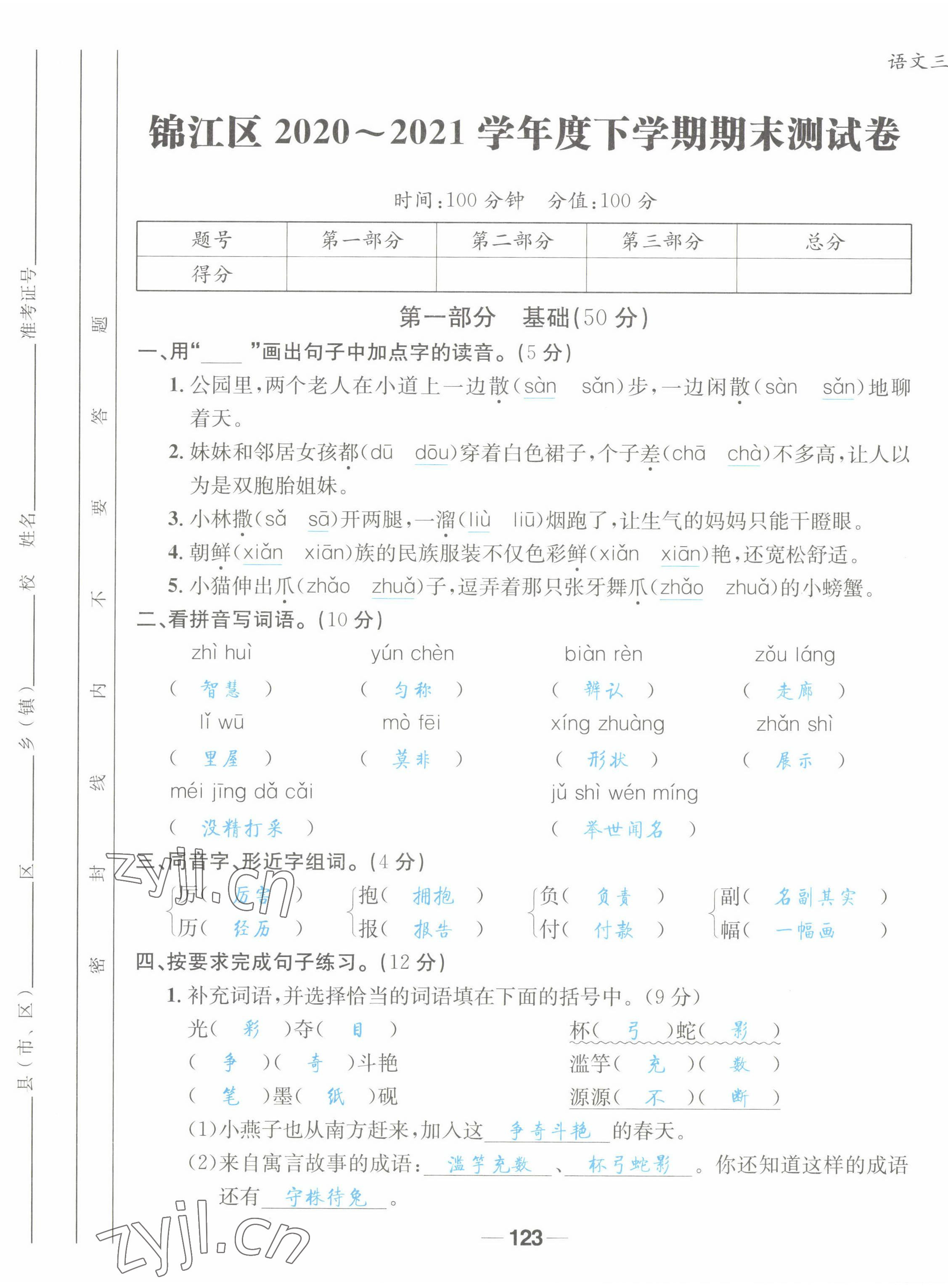 注:目前有些书本章节名称可能整理的还不是很完善,但都是按照顺序排列的,请同学们按照顺序仔细查找。练习册 2022年天府名校优课练三年级语文下册人教版 答案主要是用来给同学们做完题方便对答案用的,请勿直接抄袭。