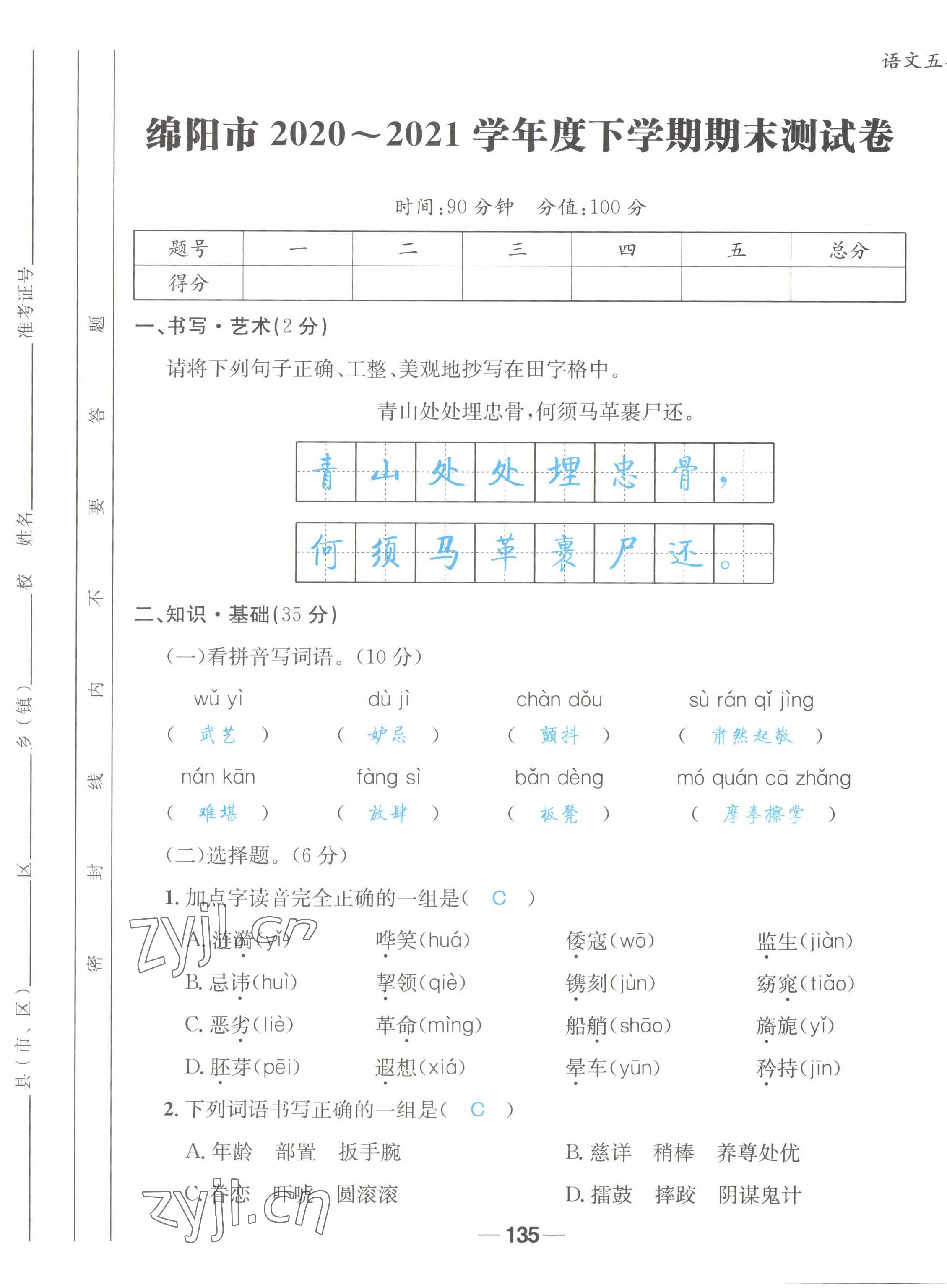 注:目前有些书本章节名称可能整理的还不是很完善,但都是按照顺序排列的,请同学们按照顺序仔细查找。练习册 2022年天府名校优课练五年级语文下册人教版 答案主要是用来给同学们做完题方便对答案用的,请勿直接抄袭。