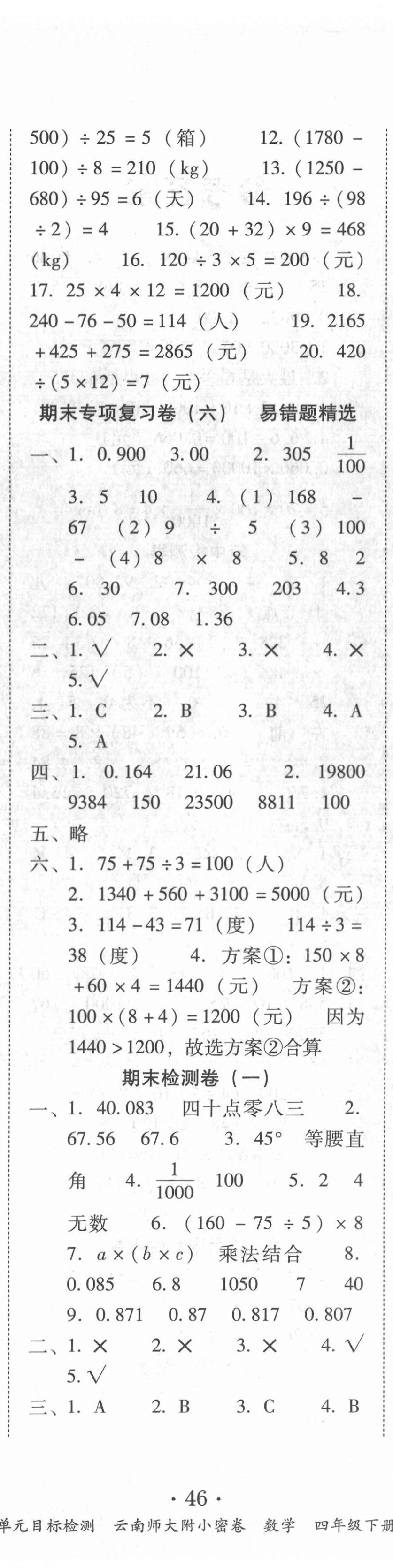 《2022年单元目标检测云南师大附小密卷四年级数学下册人教版》