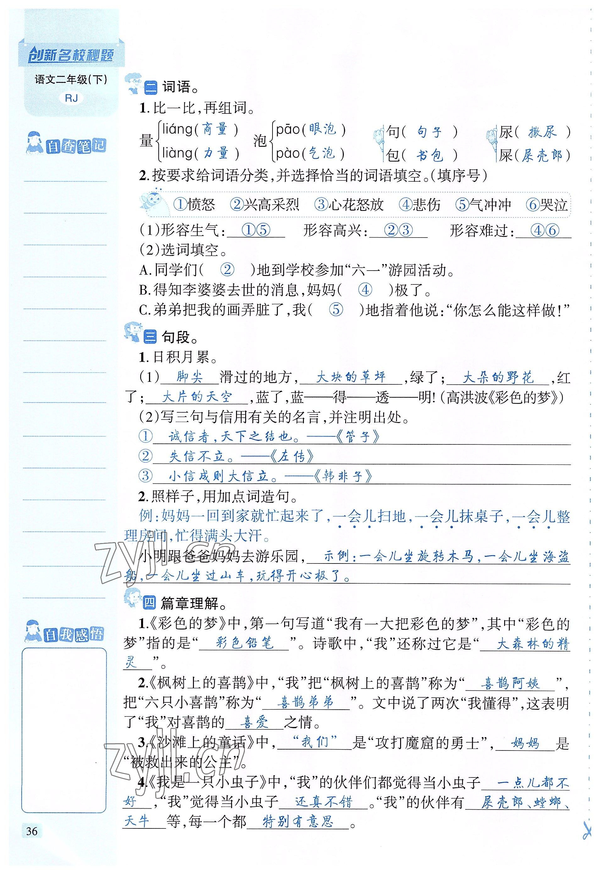 注:目前有些书本章节名称可能整理的还不是很完善,但都是按照顺序排列的,请同学们按照顺序仔细查找。练习册 2022年创新名校秘题二年级语文下册人教版 答案主要是用来给同学们做完题方便对答案用的,请勿直接抄袭。