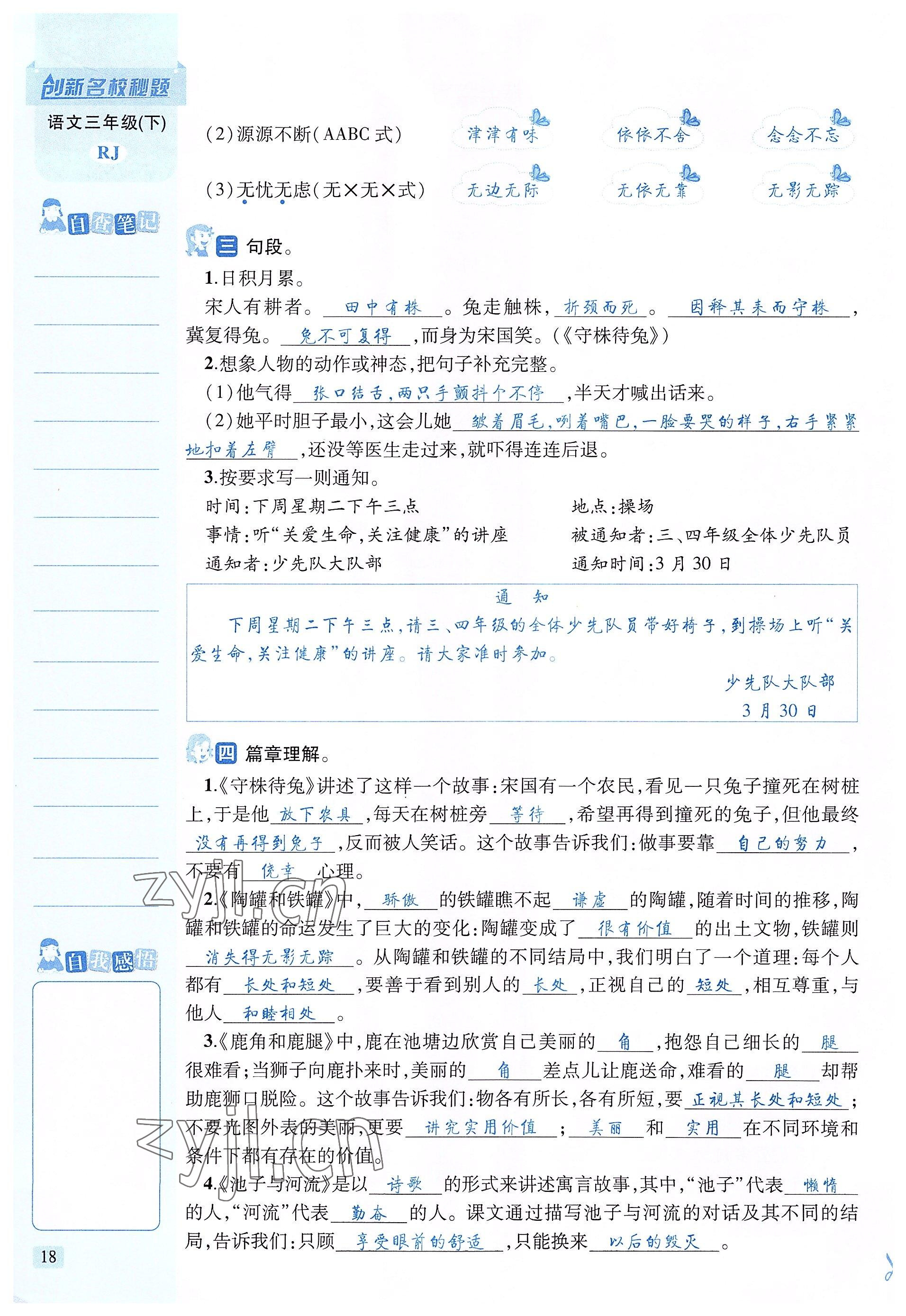 注:目前有些书本章节名称可能整理的还不是很完善,但都是按照顺序排列的,请同学们按照顺序仔细查找。练习册 2022年创新名校秘题三年级语文下册人教版 答案主要是用来给同学们做完题方便对答案用的,请勿直接抄袭。