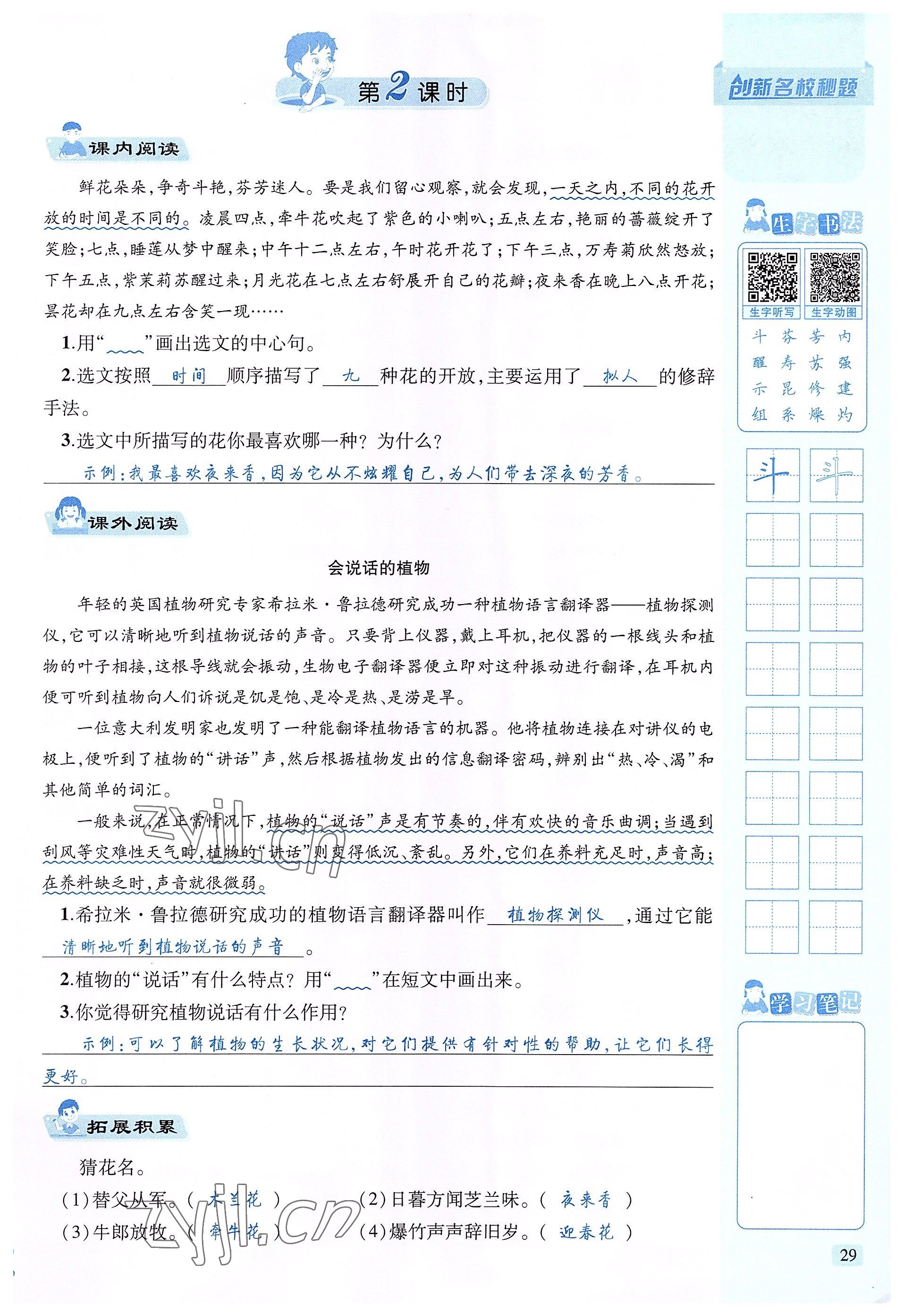 注:目前有些书本章节名称可能整理的还不是很完善,但都是按照顺序排列的,请同学们按照顺序仔细查找。练习册 2022年创新名校秘题三年级语文下册人教版 答案主要是用来给同学们做完题方便对答案用的,请勿直接抄袭。