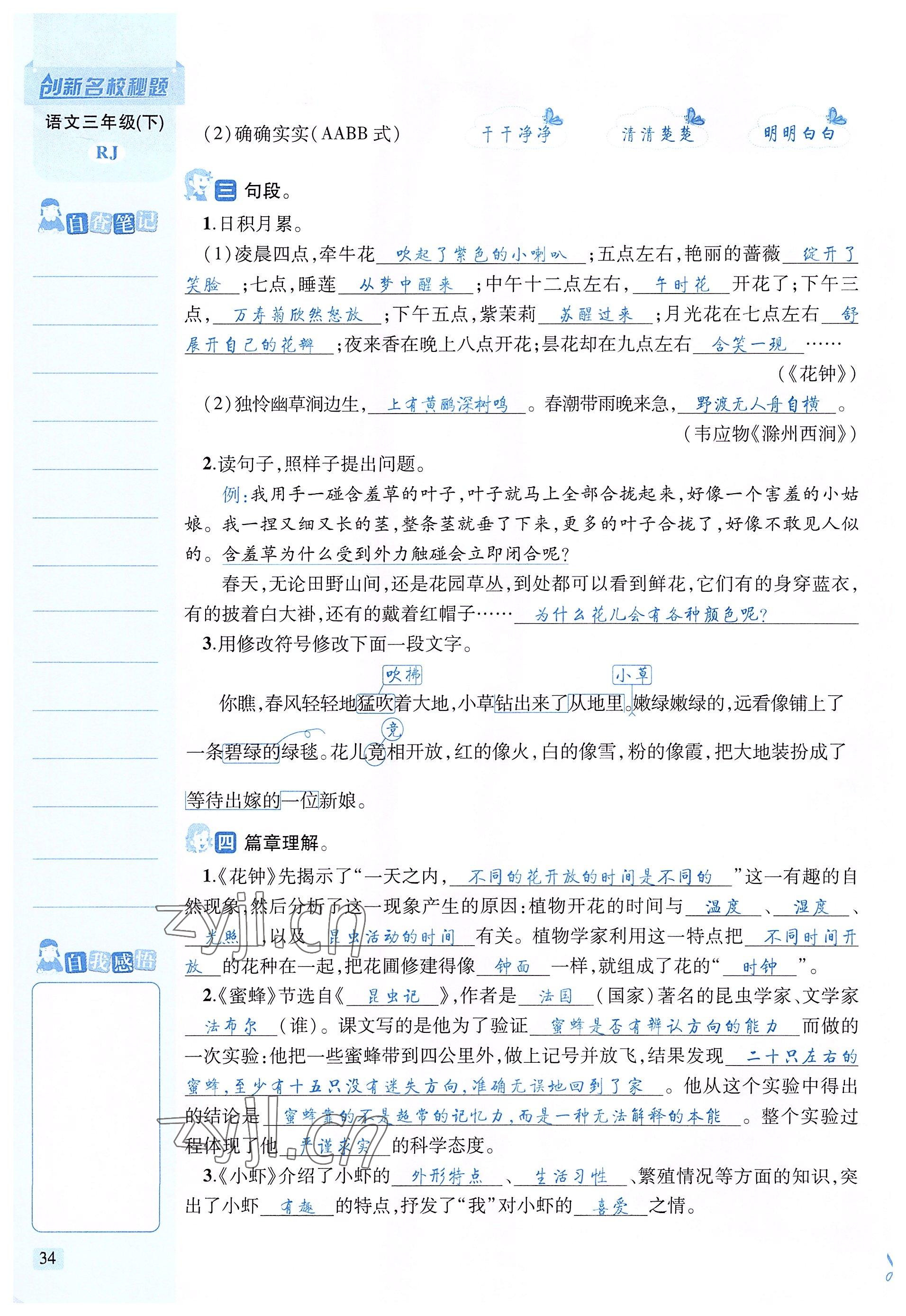 注:目前有些书本章节名称可能整理的还不是很完善,但都是按照顺序排列的,请同学们按照顺序仔细查找。练习册 2022年创新名校秘题三年级语文下册人教版 答案主要是用来给同学们做完题方便对答案用的,请勿直接抄袭。