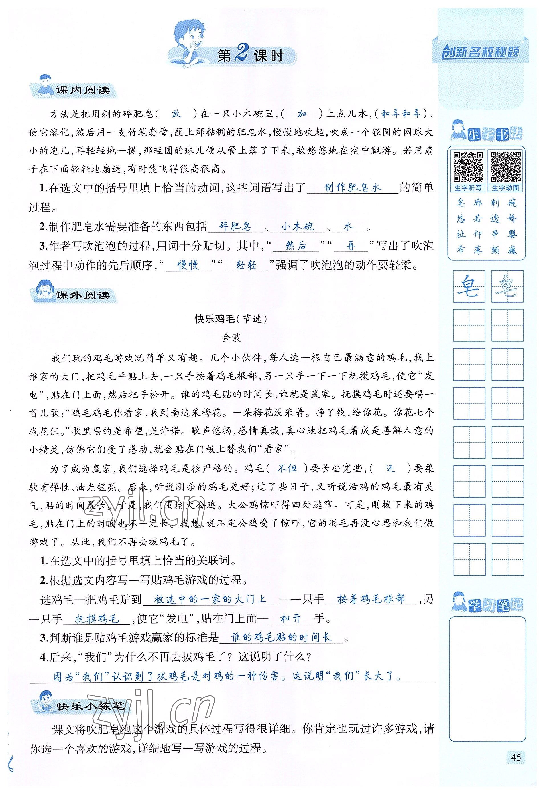注:目前有些书本章节名称可能整理的还不是很完善,但都是按照顺序排列的,请同学们按照顺序仔细查找。练习册 2022年创新名校秘题三年级语文下册人教版 答案主要是用来给同学们做完题方便对答案用的,请勿直接抄袭。
