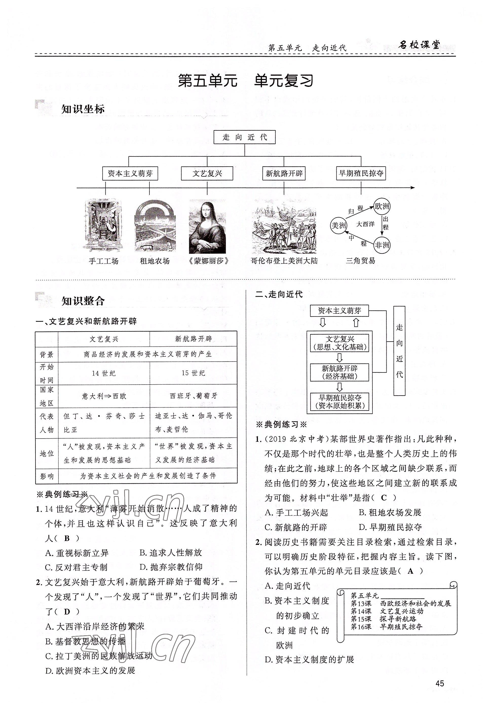 注:目前有些书本章节名称可能整理的还不是很完善,但都是按照顺序排列的,请同学们按照顺序仔细查找。练习册 2022年名校课堂贵州人民出版社九年级历史全一册人教版 答案主要是用来给同学们做完题方便对答案用的,请勿直接抄袭。