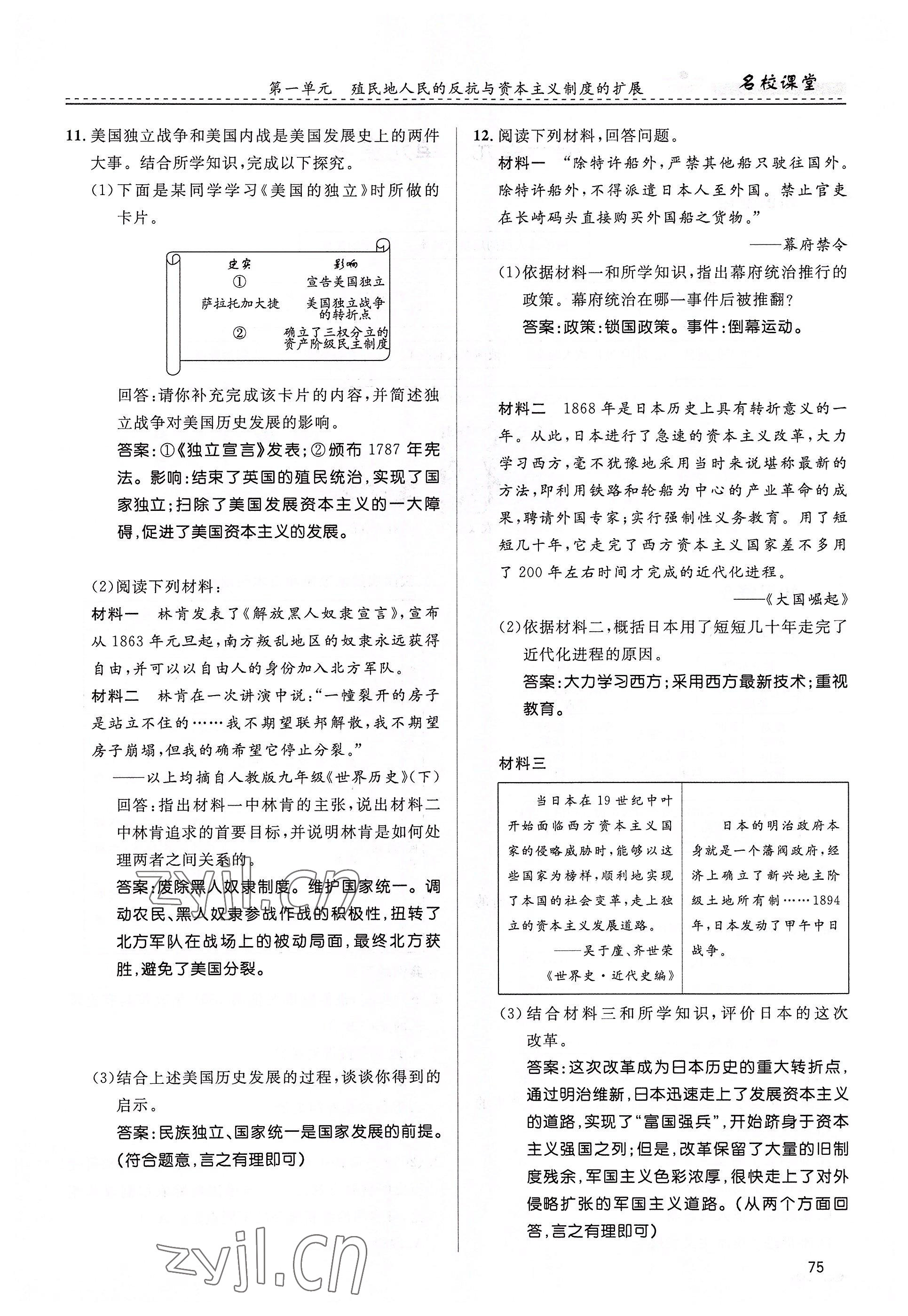 2022年名校课堂贵州人民出版社九年级历史全一册人教版