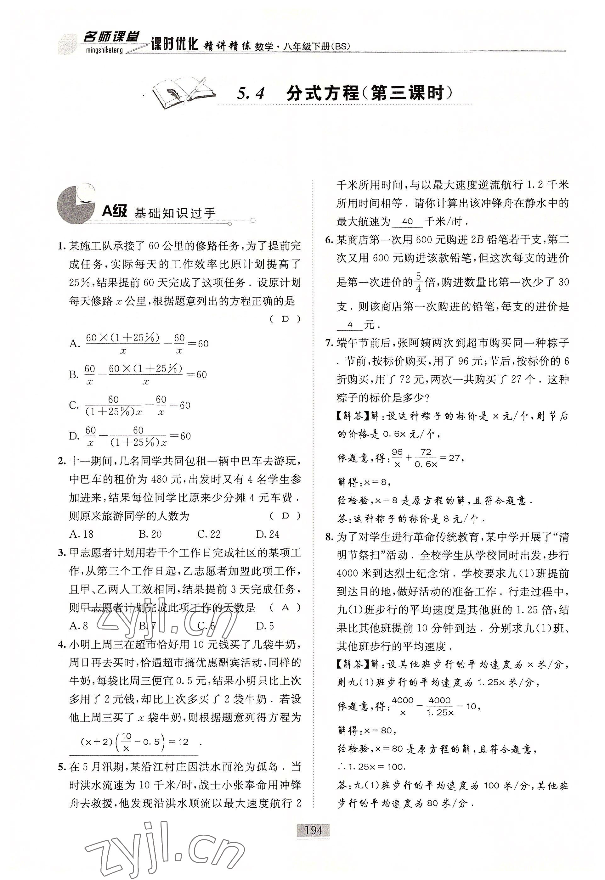 2022年名师课堂课时优化精讲精练八年级数学下册北师大版