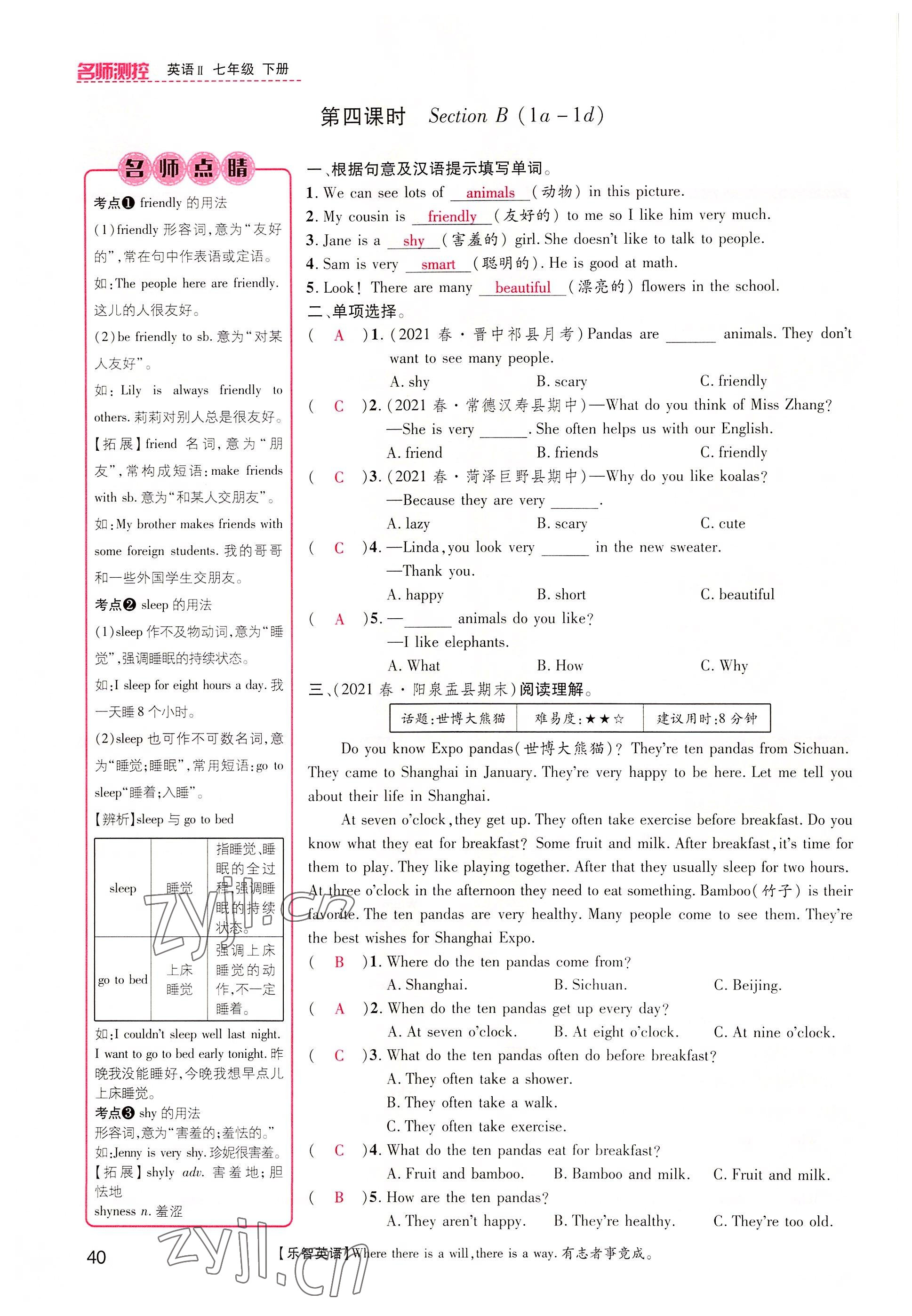 注:目前有些书本章节名称可能整理的还不是很完善,但都是按照顺序排列的,请同学们按照顺序仔细查找。练习册 2022年名师测控七年级英语下册人教版山西专版 答案主要是用来给同学们做完题方便对答案用的,请勿直接抄袭。