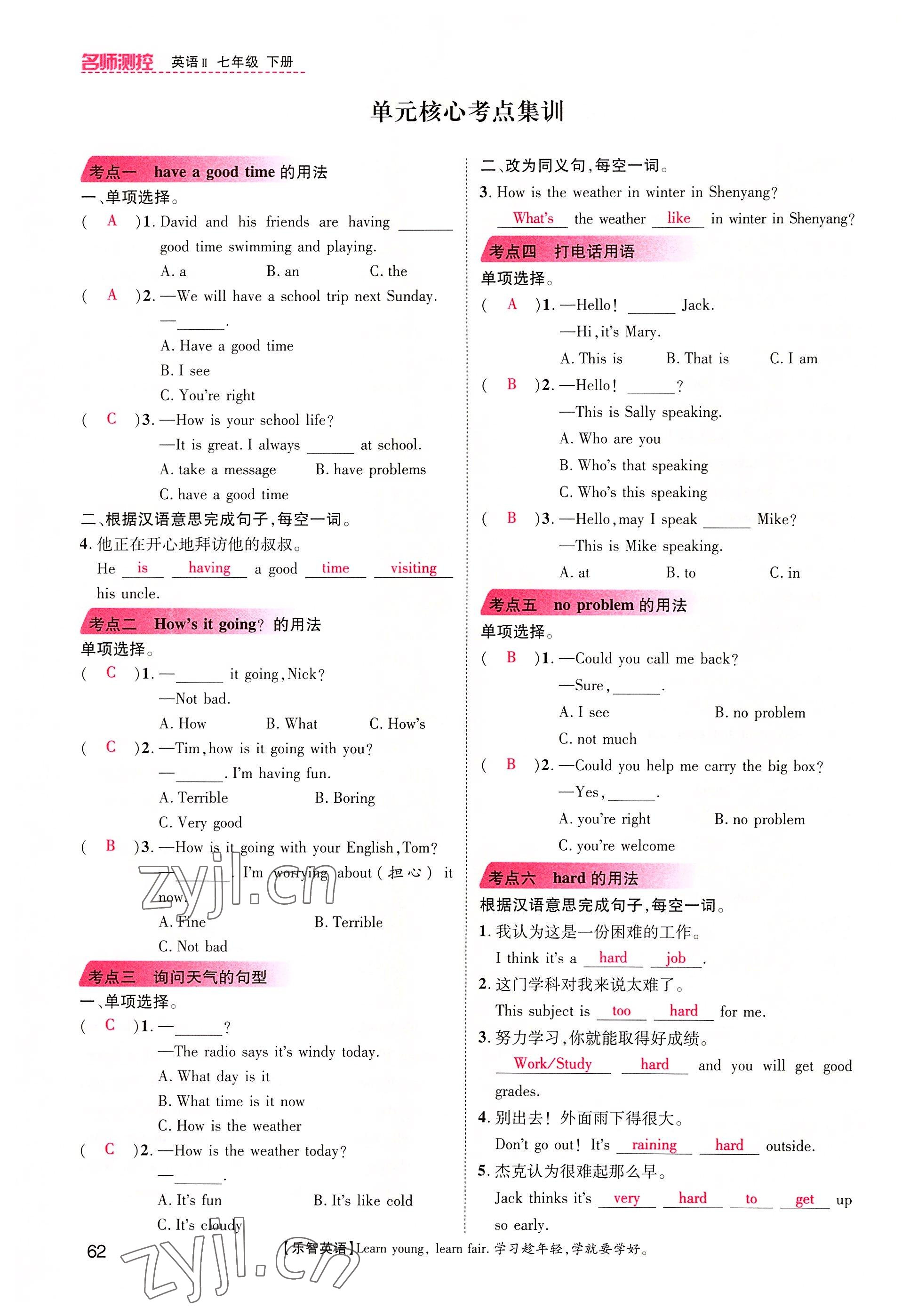 注:目前有些书本章节名称可能整理的还不是很完善,但都是按照顺序排列的,请同学们按照顺序仔细查找。练习册 2022年名师测控七年级英语下册人教版山西专版 答案主要是用来给同学们做完题方便对答案用的,请勿直接抄袭。